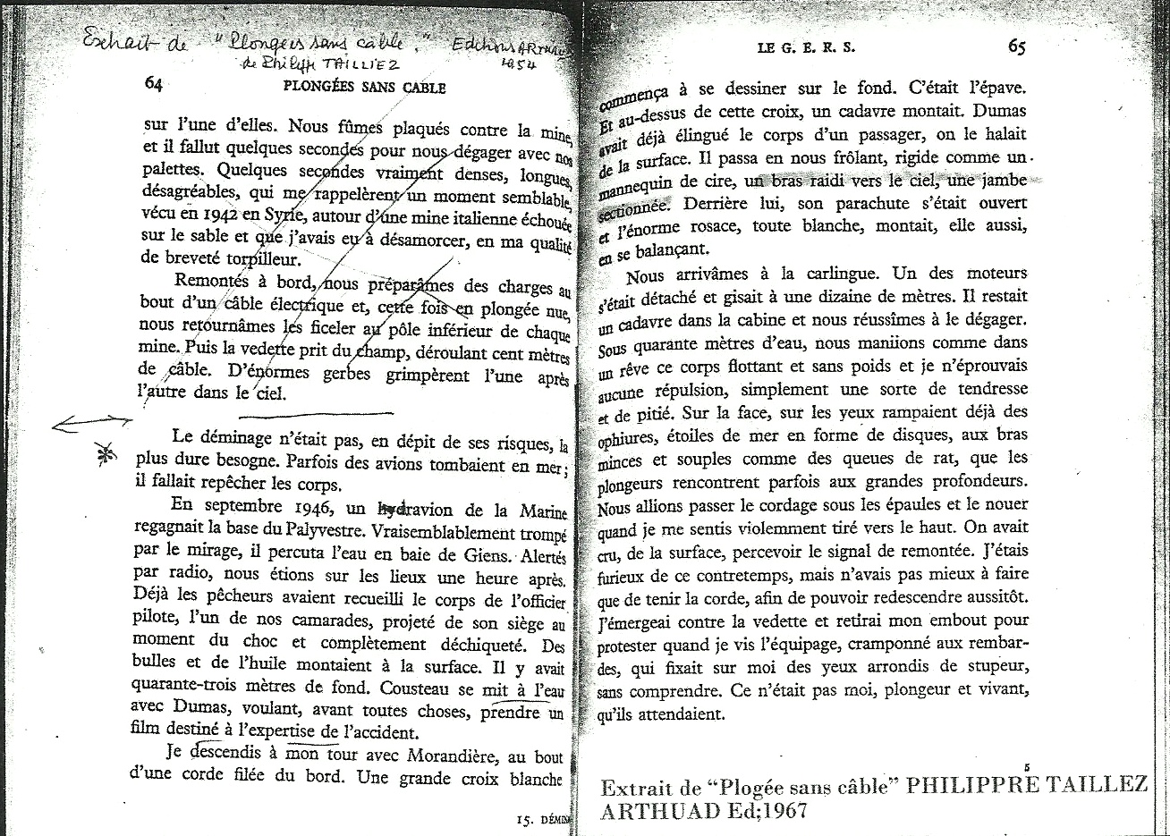 puis dans un ouvrage « Plongée sans câble » qu’il publia plus tard dans lequel on peut lire les difficultés de leur mission: