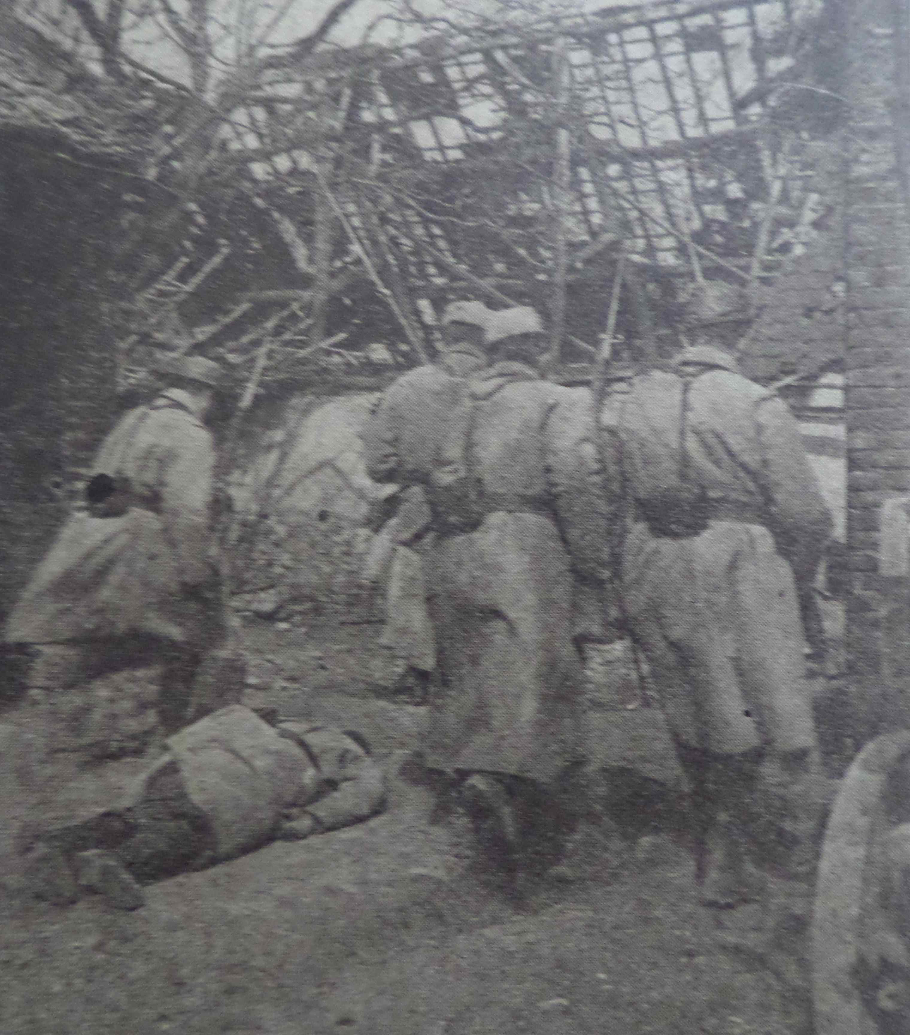 un groupe à l’attaque dit la légende avec un homme qui vient de tomber… Image volée d’une attaque ou scène d’entrainement ou posée ?