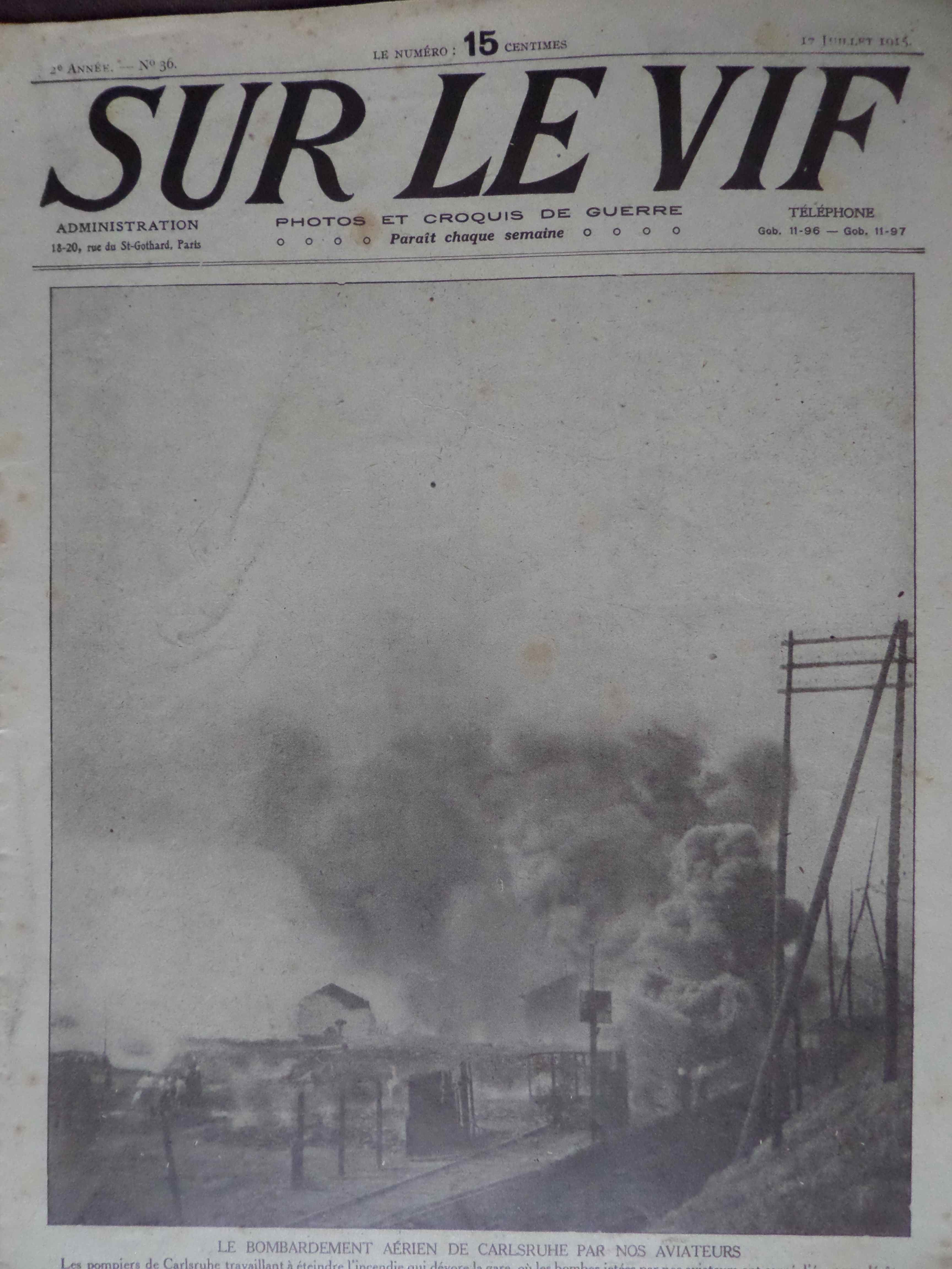 Des vues de Carlsruhe (Karlsruhe) en Allemagne bombardé par l’aviation française. De la fumée des incendies et des destructions comme on le voit en 4ème de couverture: