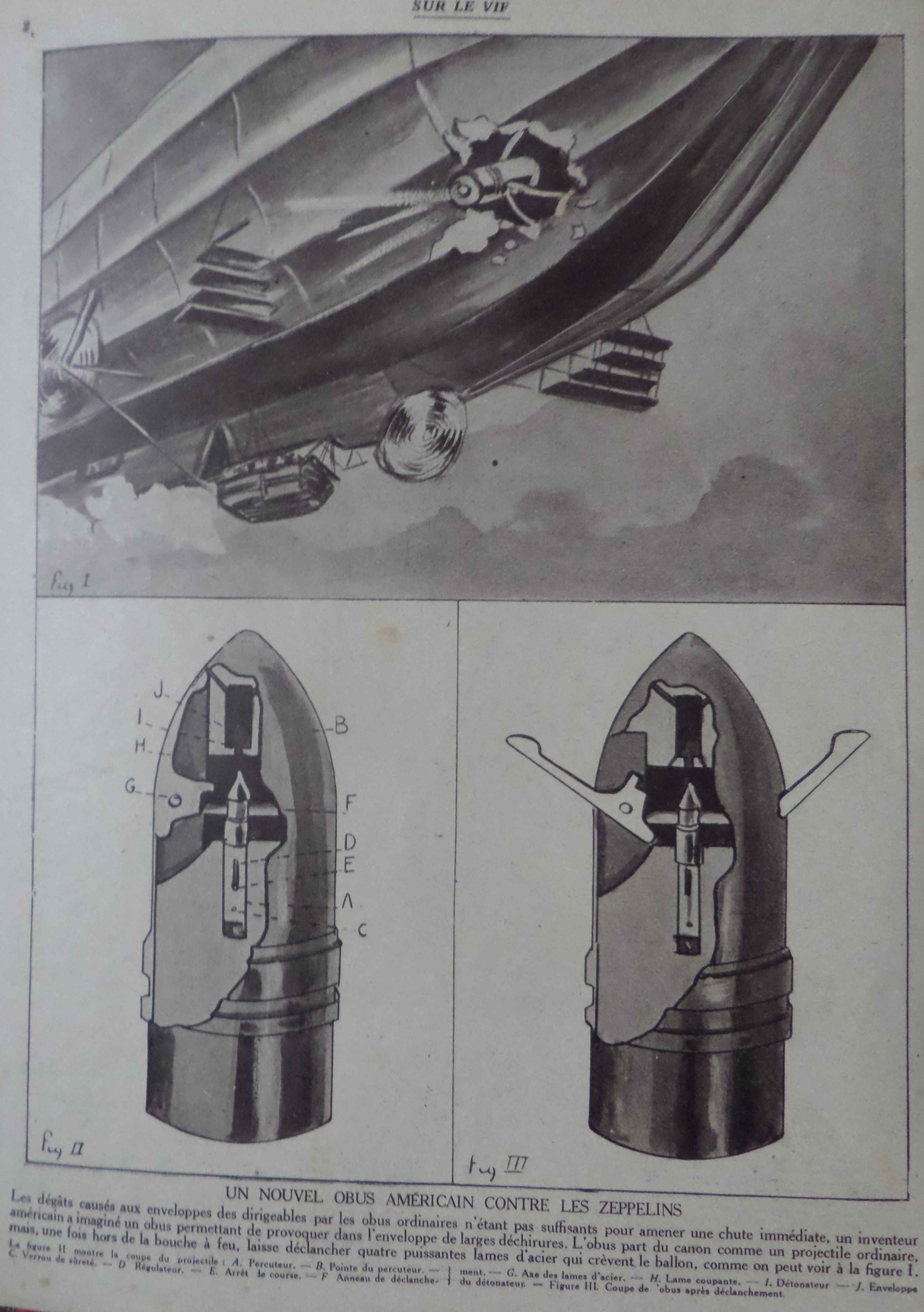 De bombe, il en est aussi question sur les dessins de cette page où l’on nous présente une nouvelle arme américaine pour détruire les Zeppelins. Un obus ordinaire qui, une fois tiré, voit s’ouvrir 4 ailettes qui déchirent l’enveloppe du dirigeable.
