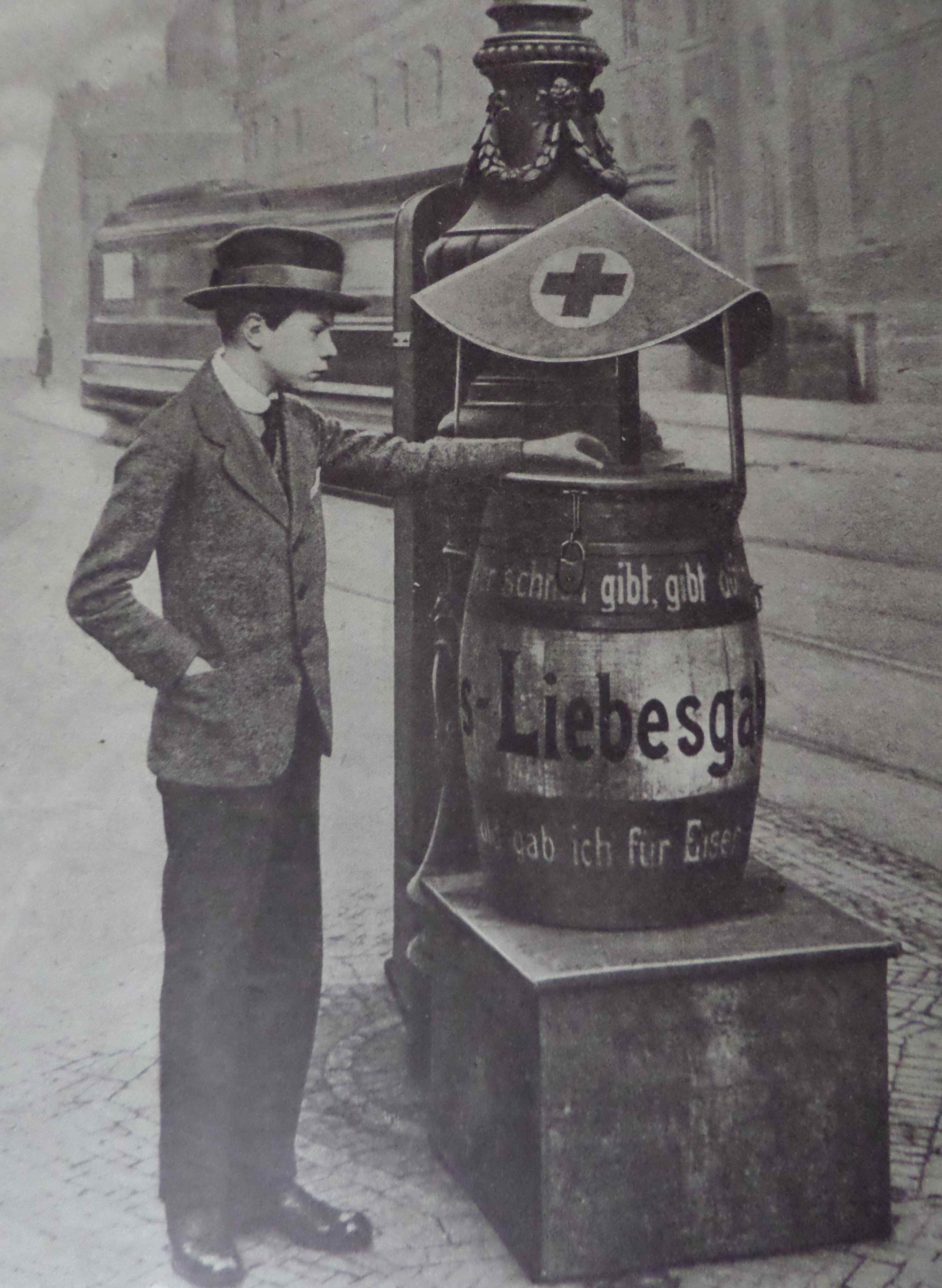 En Allemagne, c’est la crise du cuivre et du fer. On fait donc la chasse au gaspi et ces tonneaux placés dans les rues servent à récupérer ces précieux métaux (pour la confection des armes et munitions):