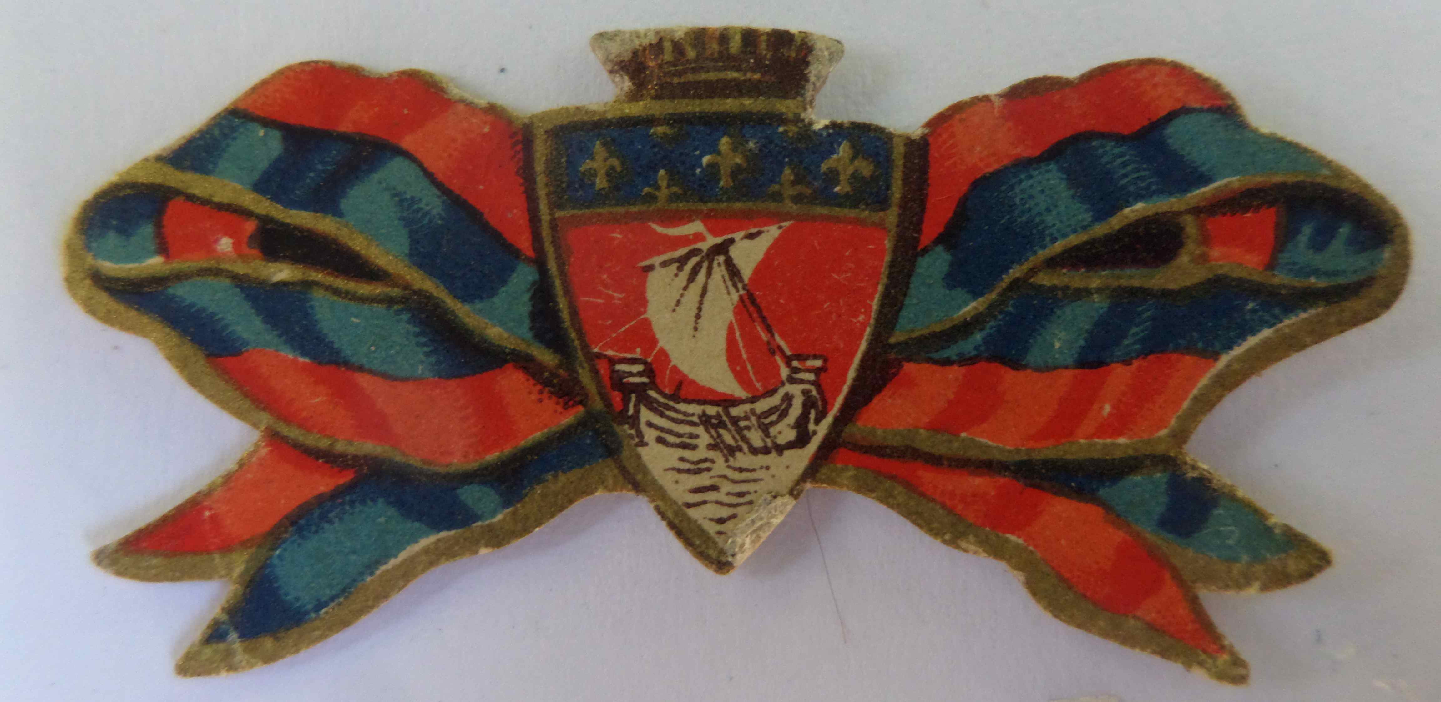 Un noeud de rubans aux couleurs de Paris, rouge et bleu, avec au coeur l’écusson de la capitale. Collecte organisée le jour de la Fête Nationale 1916 au profit des oeuvres de guerre de l’Hôtel-de-Ville.