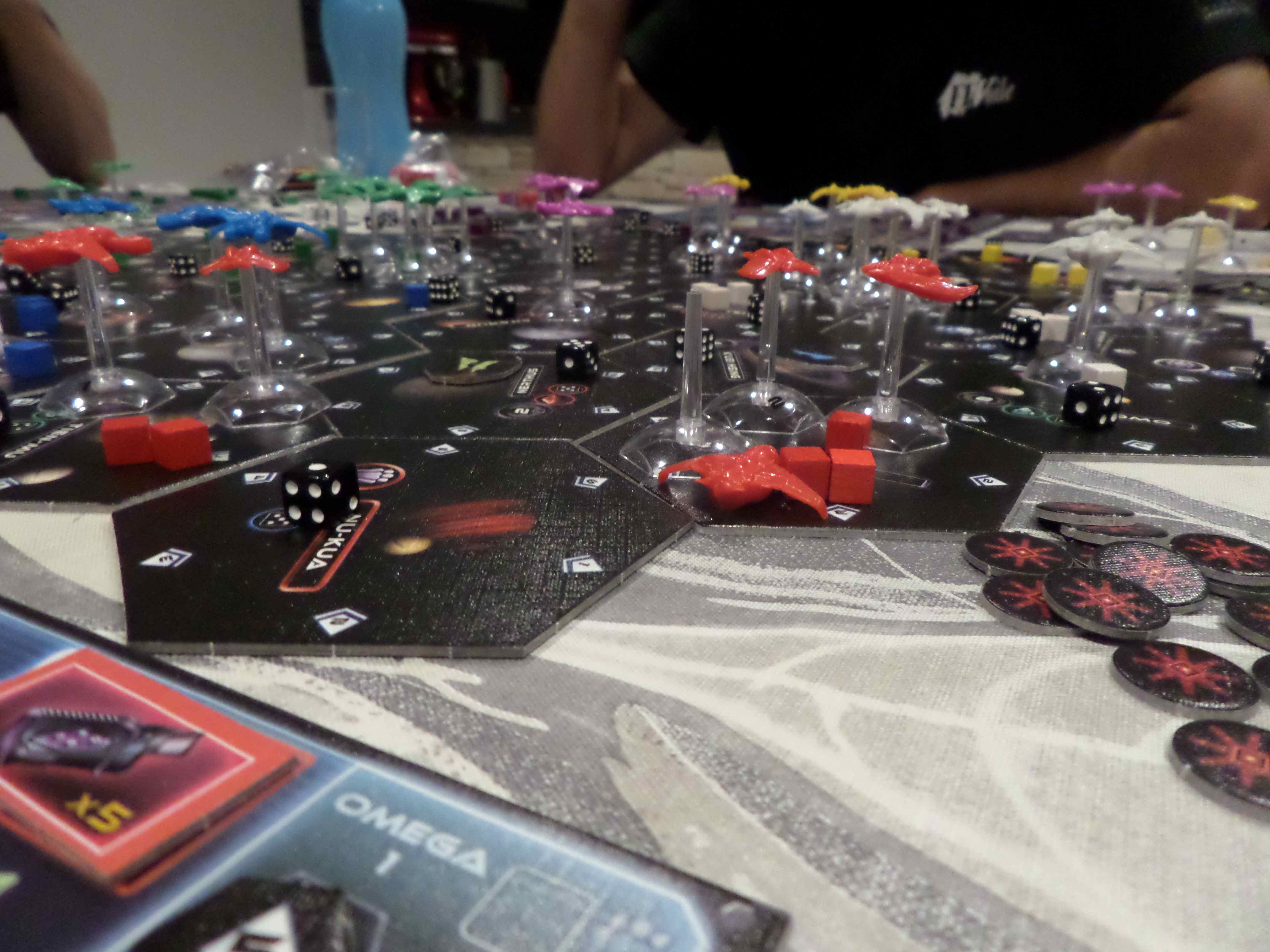 et les petits dés qui baissent de 1 à chaque tour, matérialisant les ressources des planètes qui s’épuisent à mesure qu’on avance dans le temps.