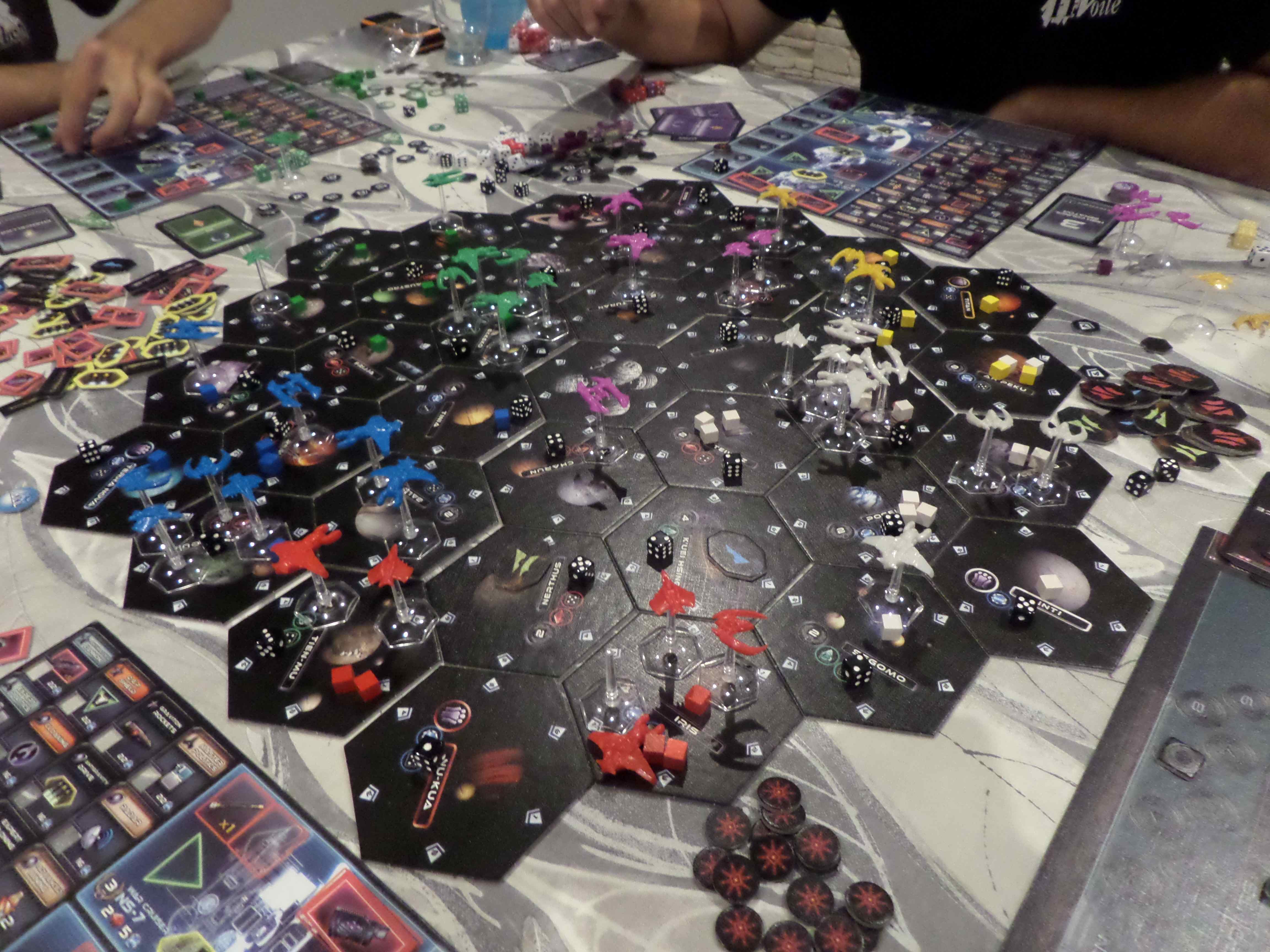 un jeu de développement dans l’espace et de luttes interstellaires (ici le couvercle de l’extension avec laquelle nous n’avons pas joué). Tout en anglais avec cette fois un peu plus de mal avec de nombreux développements de techniques pas faciles à maîtriser.