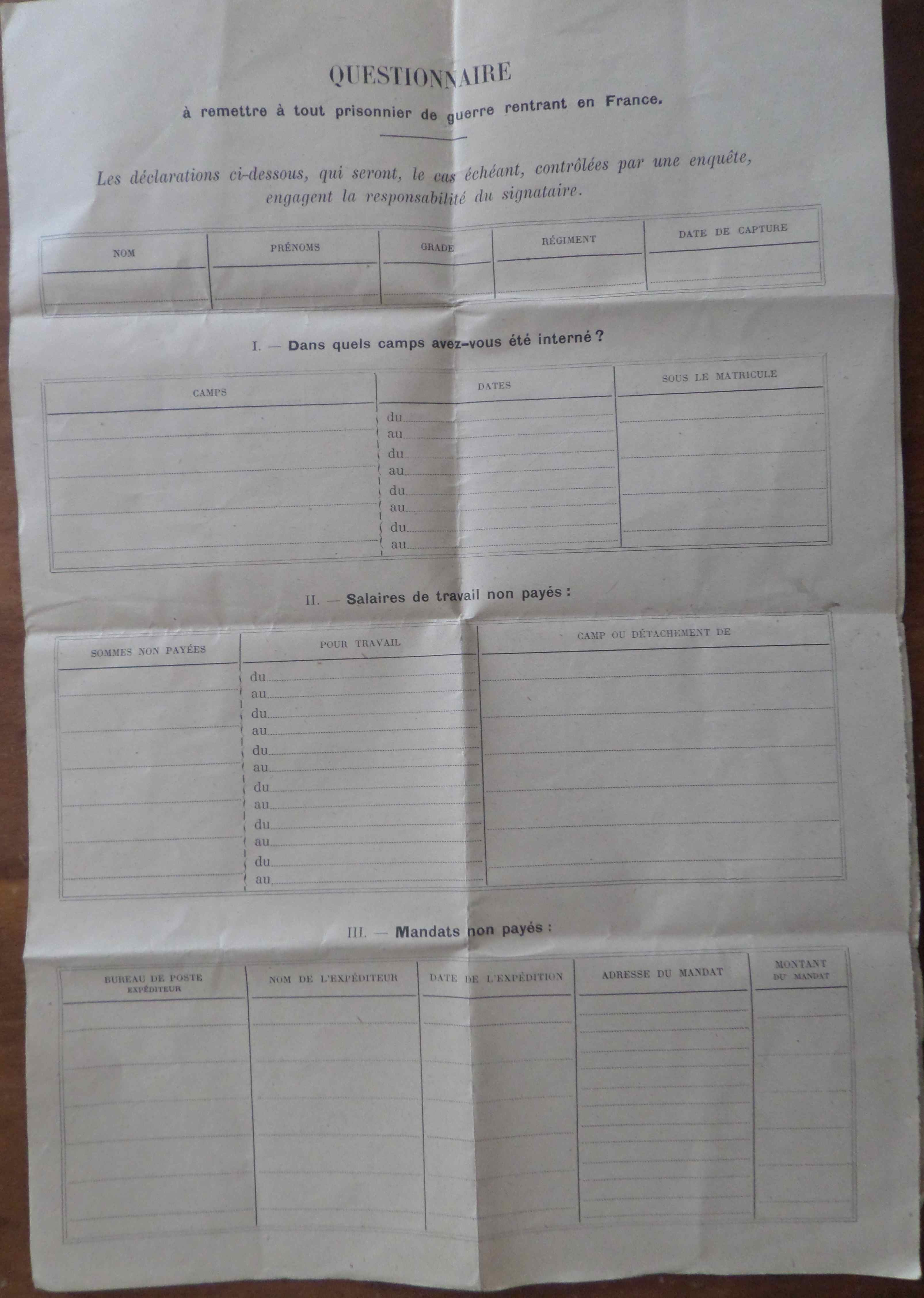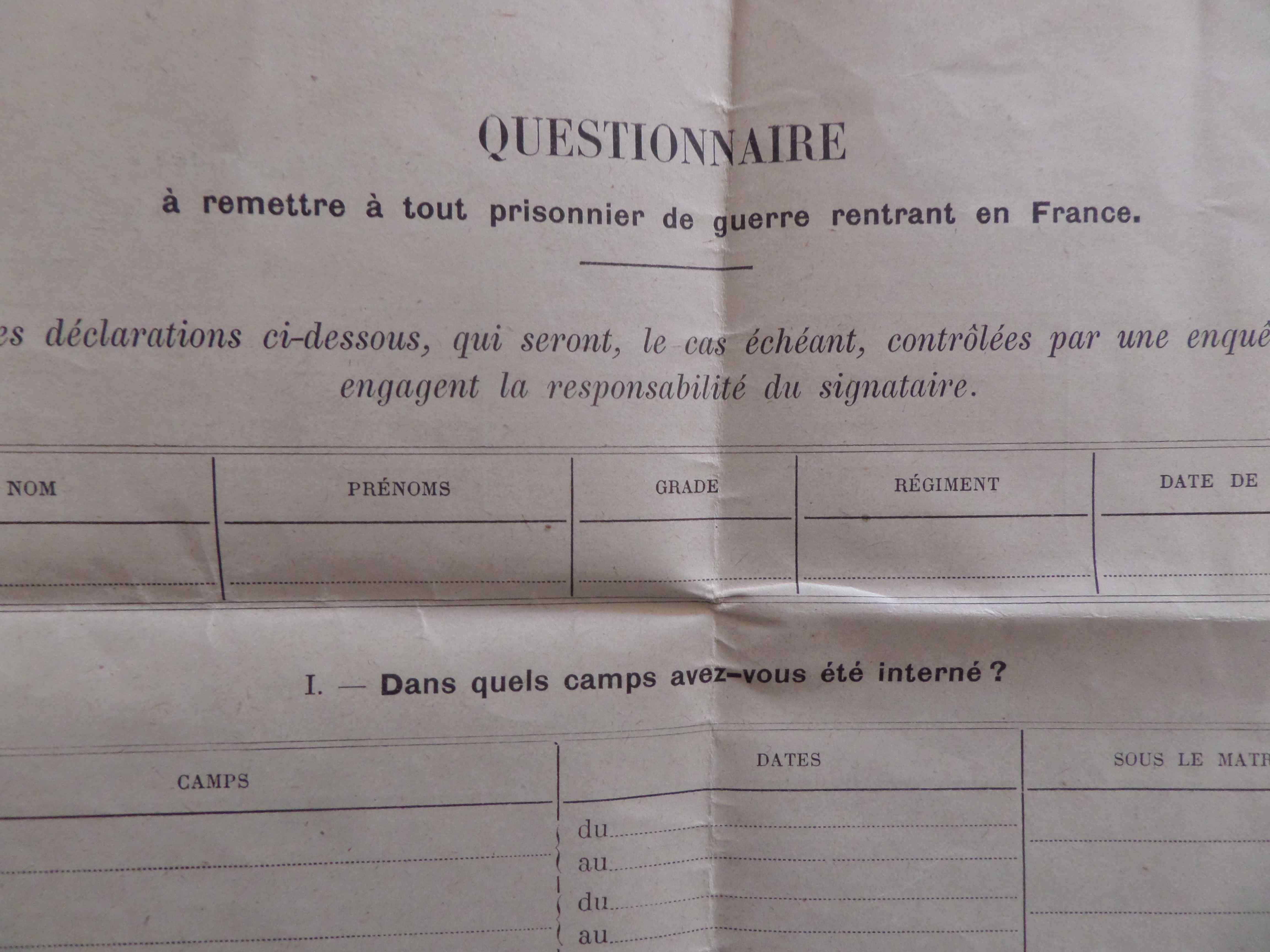 Il s’agit de ce formulaire de 4 pages que les Prisonniers de Guerre devaient remplir au retour de leurs années de captivité pour « raconter statistiquement » leurs séjours: