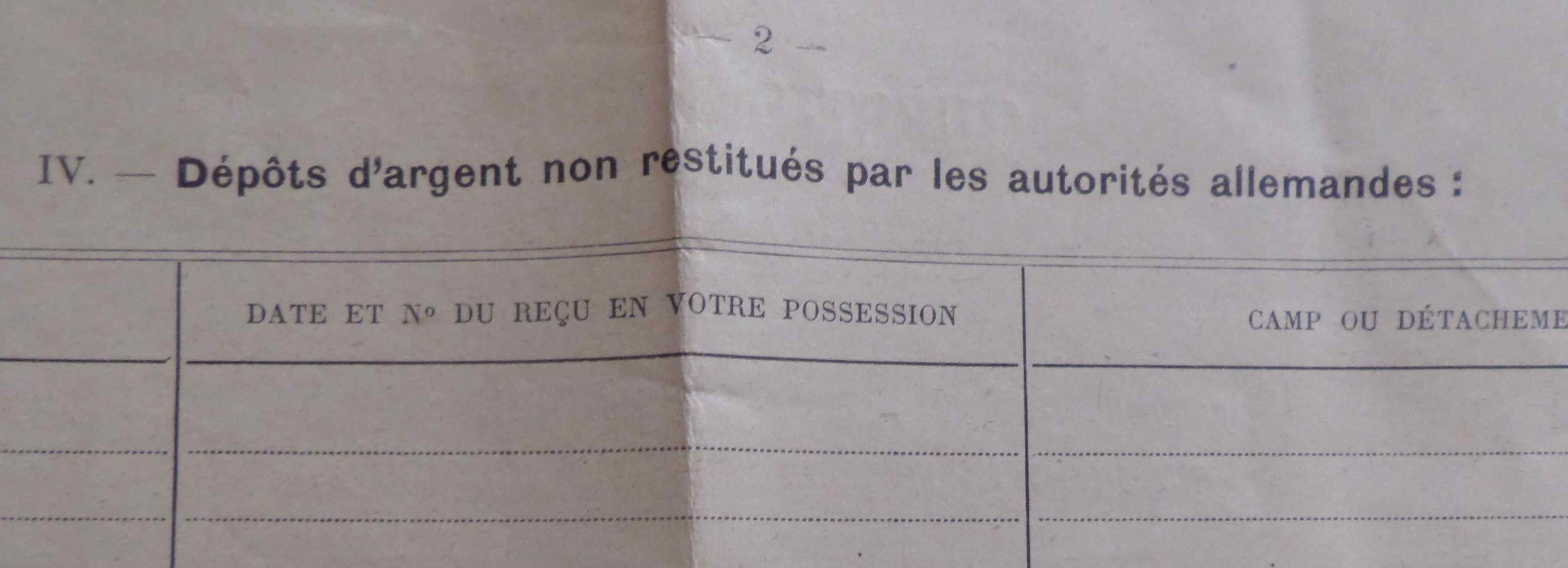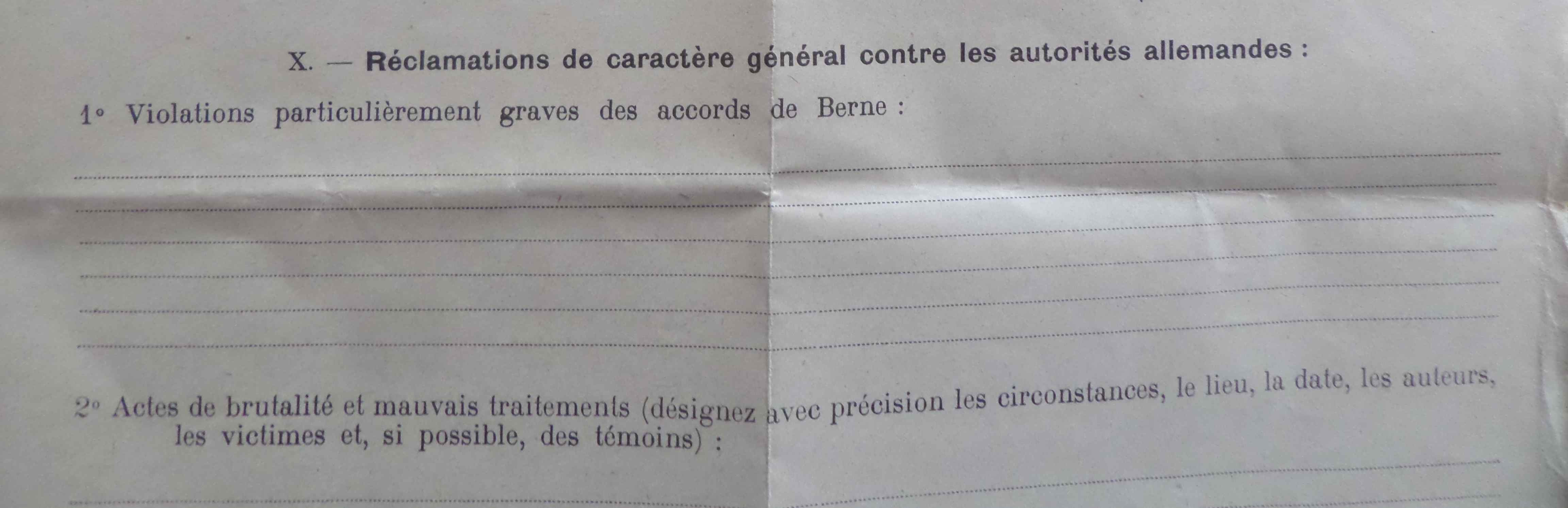 De telles feuilles devaient servir à indemniser les prisonniers ayant subi des vols ou des brimades et peut-être inclure l’indemnisation des P.G. français dans le calcul de la Dette de Guerre dont devra s’acquitter l’Allemagne.