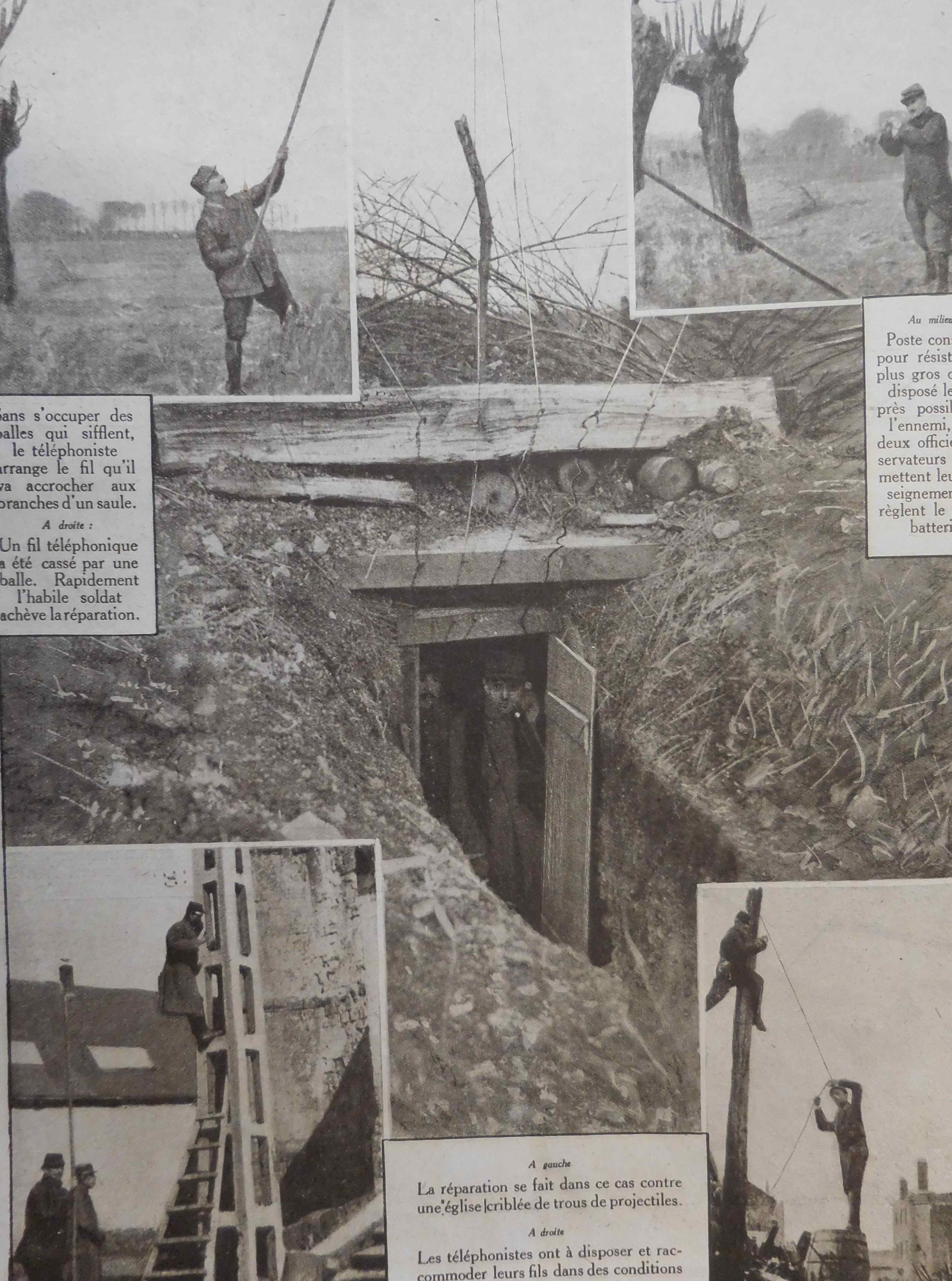 Des téléphonistes installant et testent des liaisons aériennes avec un ballon captif. Sur ce même sujet des télécommunications, des hommes posant des fils aériens, ce qui quelquefois n’était pas sans risque.