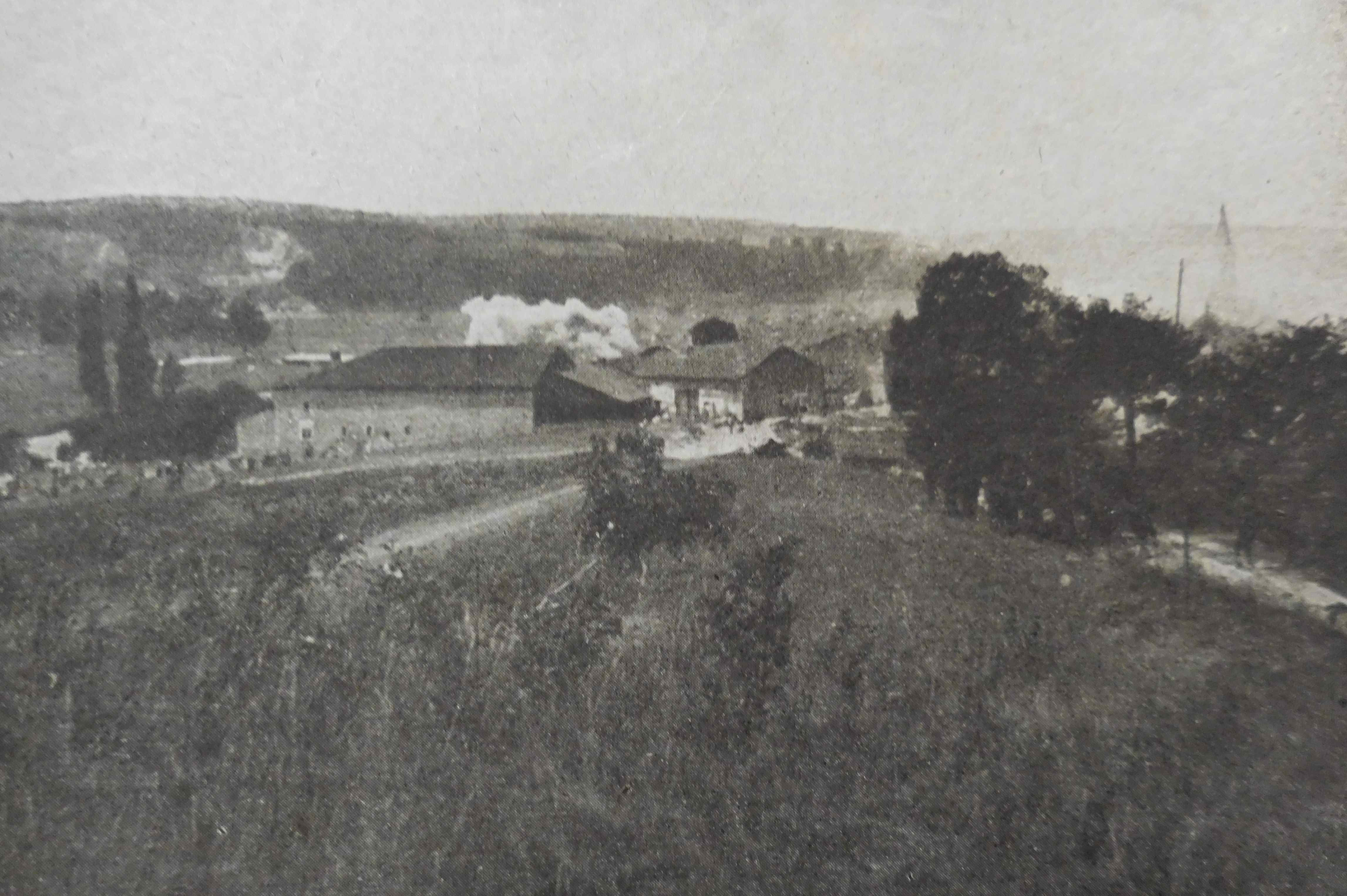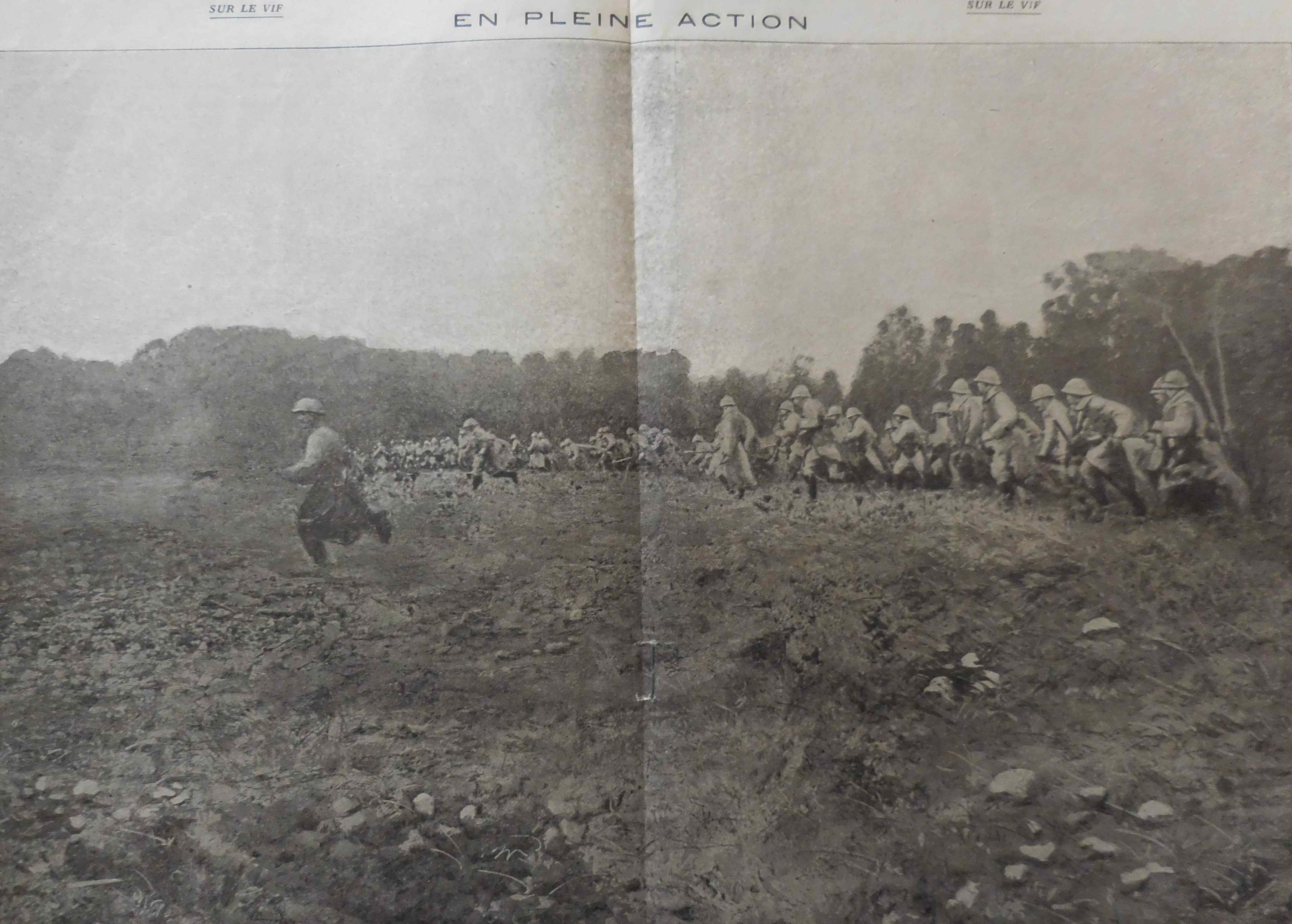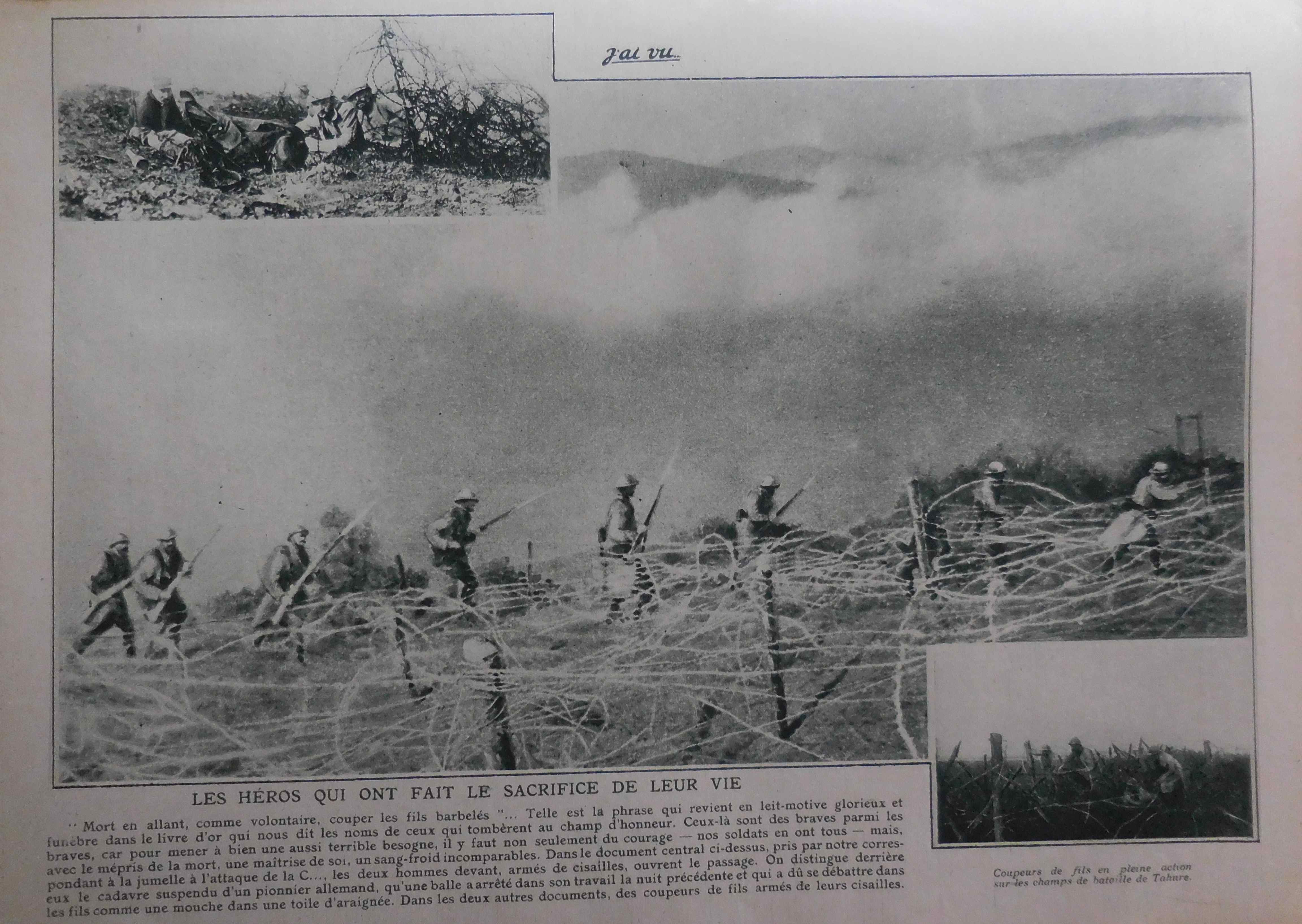 Une scène de combat (nous dit-on) avec une charge d’infanterie photographiée grâce à des jumelles et sur les côtés des hommes en train de couper des fils de fer barbelés. En haut à gauche, un homme a déjà été tué pendant qu’il était occupé à cette tâche.