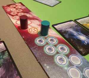 Le suspens était insoutenable avant le dernier tour, décisif puisque visiteurs (pion bleu) et monstre (pion rouge) étaient à 1 saut de l’arrivée (la case étoile). Toute carte trouvée du monstre lui donnait la victoire, sinon, elle allait aux coopérants.