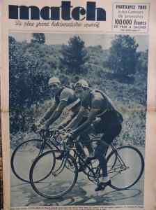 Match du 16 juillet 1937 avec Sylvère Maes et Roger Lapébie sur la route de Montpellier. Les deux rivaux s’entendent bien pour l’instant et se prêtent aux objectifs de photo-reporters.