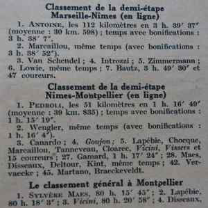 Le Miroir des Sports du samedi 17 juillet 1937. A la une, Roger Lapébie, l’espoir français pour la victoire finale de ce Tour, se restaure à Nîmes avant de repartir vers Montpellier. En effet, deux demi-étapes étaient au programme pour muscler cette randonnée relativement plate entre Marseille et Montpellier avec un arrêt central vers Nîmes.
