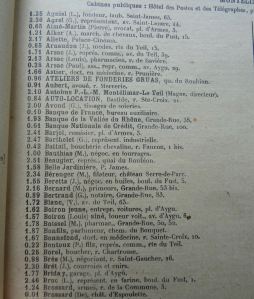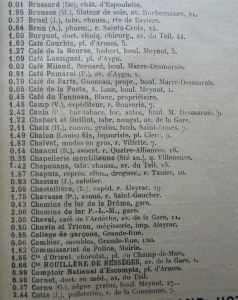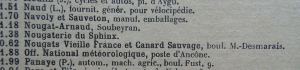 …Arnaud Soubeyran, le Sphinx et la marque Vieille France et Canard Sauvage. Ce ne sont pas les seuls puisque d’autres confiseurs sont inscrits à la lettre de leur patronyme. Vous pouvez chercher dans la liste des (environ) deux cent cinquante lignes ci-dessous. Revenons une seconde sur le document ci-dessus avec le numéro de l’Office National Météorologique situé tout près d’Ancône et de l’aérodrome qui avait été créé il y a peu. On devait composer le 1.88 pour connaître le temps qu’il allait faire. La station météo existe toujours au même endroit mais le ministère de tutelle souhaiterait bien s’en débarrasser.
