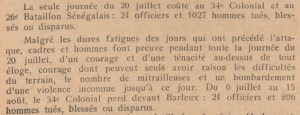 Son grand frère connut le même sort quelques mois plus tard, dans la Somme, le 18 août 1916, lors de cette fameuse bataille sensée être la réponse à l’attaque allemande sur Verdun. Les Coloniaux du 34ème Régiment d’Infanterie tiennent en cet été funeste le secteur de Barleux. Le régiment est envoyé à l’attaque des tranchées allemandes sous la mitraille, le 20 juillet. Est-ce ce jour que Louis est touché ? La lecture de la narration de cette attaque dans le livre officiel de l’unité fait froid dans le dos…