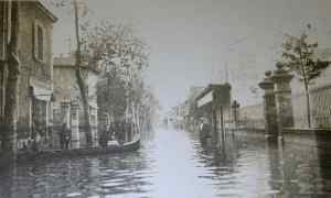 Difficile de retrouver l’endroit exact où le photographe s’est placé tant des immeubles modernes ont « poussé » sous la pression démographique. Les gens se déplacent en barques sauf ce promeneur courageux ou prétentieux qui pose avec de l’eau jusqu’aux genoux. Grippe assurée car à partir du 12-13 novembre, la douceur était passée et il fit alors relativement frais sur la région.