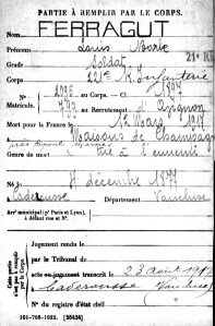 Louis Barbe Ferragut, matricule 799 classe 1897, bureau de recrutement d’Avignon, pour ceux qui souhaitent aller consulter sa fiche matricule sur le site des Archives du Vaucluse. Le patronyme Ferragut est très répandu en Vaucluse et à Orange. Si une personne reconnaît en ce Poilu, un ascendant direct ou indirect, qu’il n’hésite pas à se manifester pour compléter ou corriger cette petite biographie.