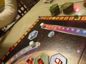 Personnellement, je n’arrive à construire qu’une seule forêt et une seule ville… tout de même située sur le satellite de Mars, Phobos. Je en décolle pas dans les productions de ressources de base. Je participe allègrement à la terraformation de Vénus sans que cela soit très spectaculaire. La majorité des mes points provient d’une belle collection de cartes bleues, ce qui me permet d’être efficace dans l’oxygénation de Mars. Mais insuffisant en bout de compte.