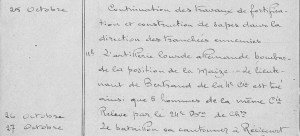 C’est en effet juste avant la relève du 26 octobre 1914 qu’un bombardement frappe l’unité un jour de calme relatif, le 25 octobre… comme on peut le lire dans le Journal de Marche ci-dessous.