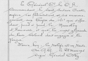 On est au tout début de la grande bataille commencée le 21 février 1916 et qui s’achèvera à la fin de cette année-là. C’est ce que nous raconte le Journal de Marche du 141ème pour les journées des 21 et 22 mars 1916. Et quand le feu des canons cessent, ce sont les fantassins allemands qui passent à l’attaque.