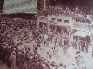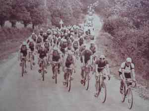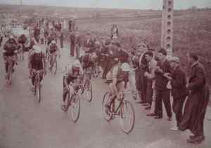M. le Curé et ses paroissiens applaudissent les forçats de la route dans la côte d’Iffignac que rendra célèbre trente ans plus tard, Bernard Hinault, originaire de ce coin.
