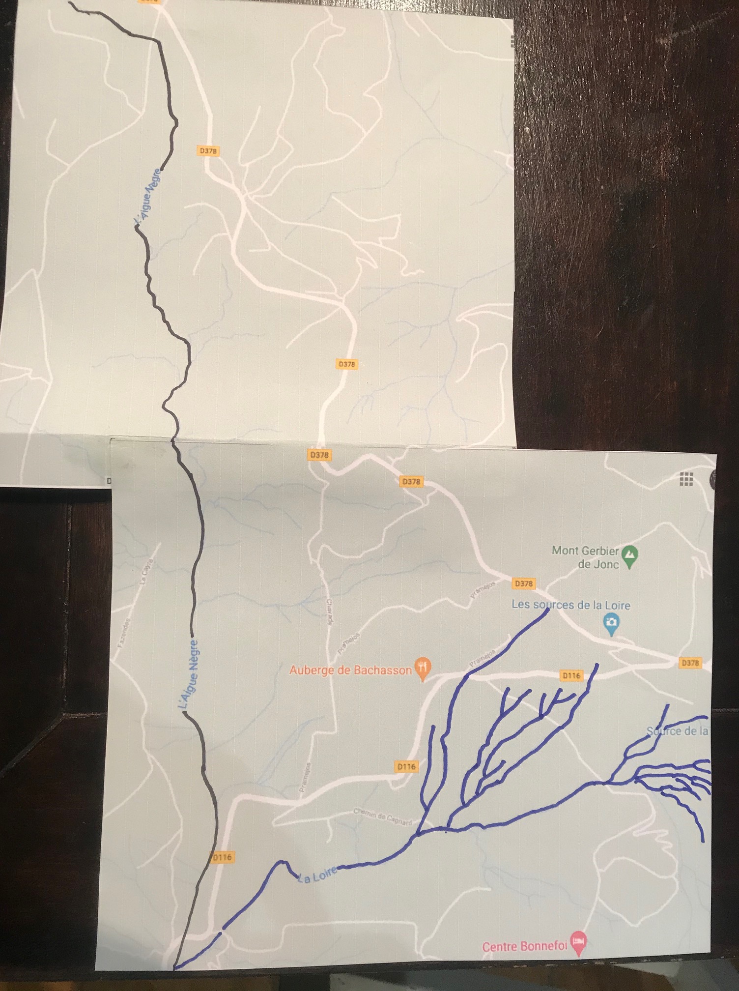 …le trait noir, celui d’Aigue-Nègre est plus long que n’importe lequel des traits bleus, ceux des sources de la Loire… 4,6km contre 2,5km. Y a pas photo !