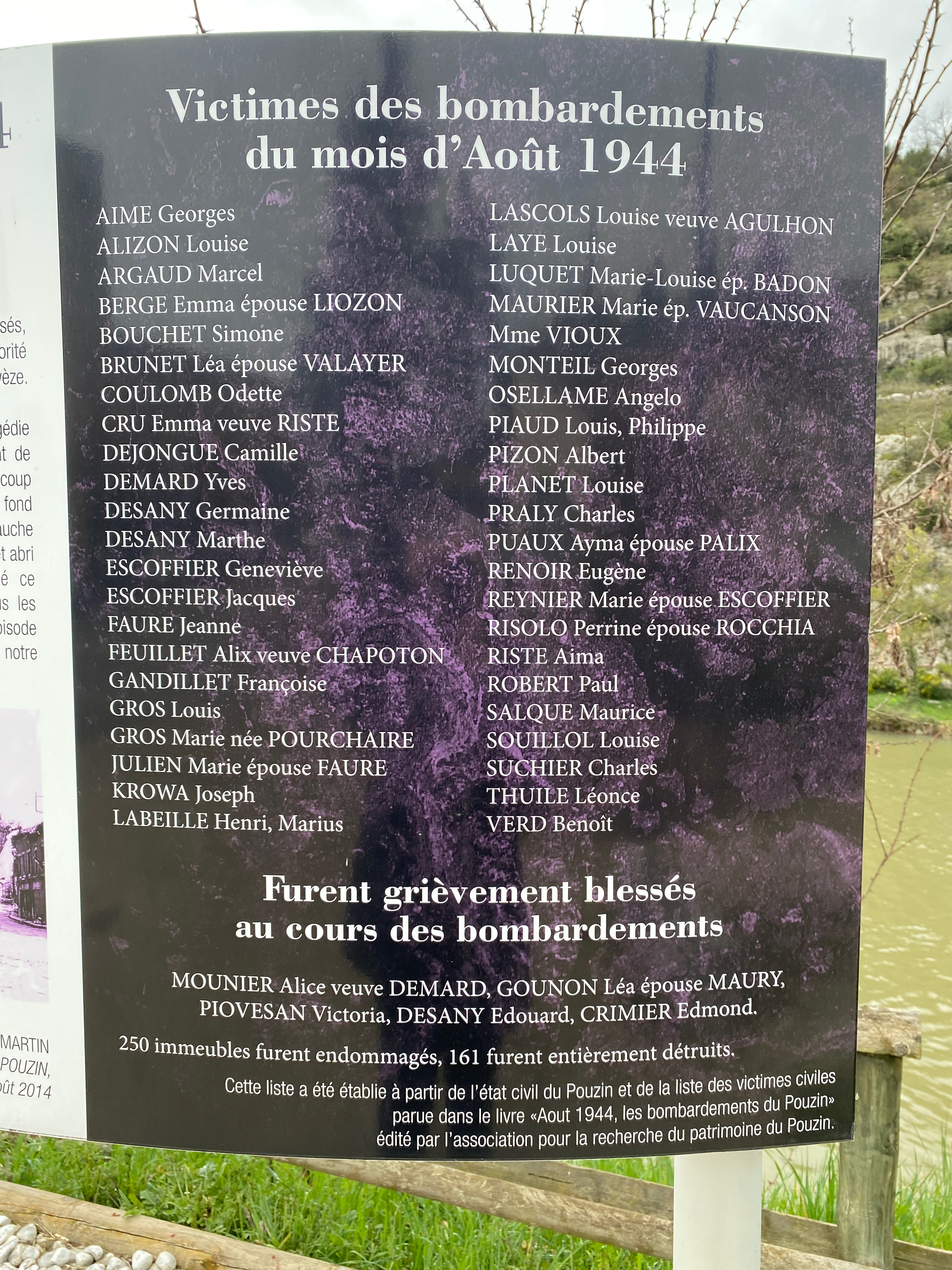 Bilan des trois bombardements alliés du Pouzin d’août 1944 : 44 morts, des centaines de blessés dont 8 grièvement, 250 immeubles endommagés dont 161 totalement détruits.