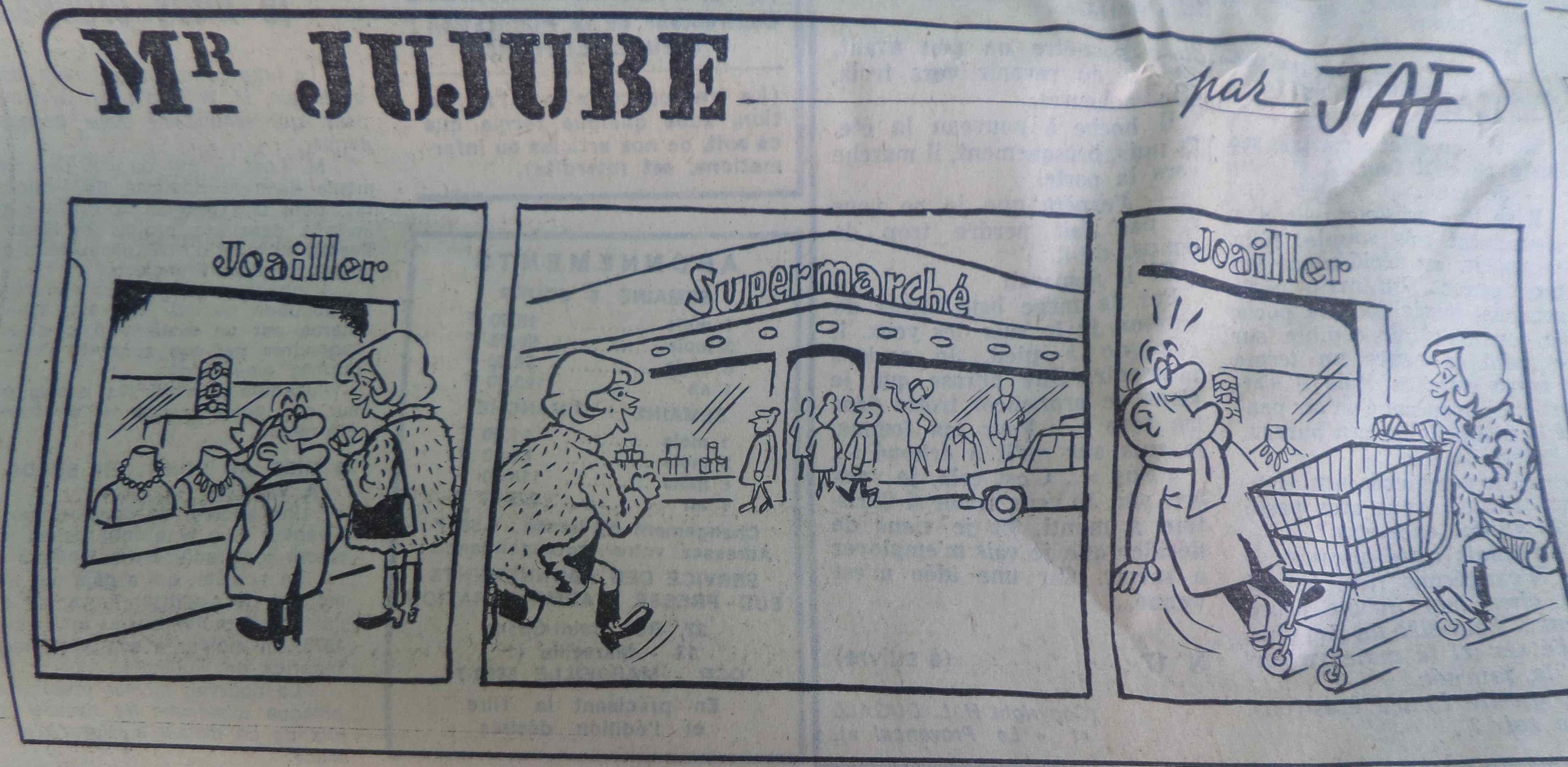 Mr Jujube, c’est ce petit bonhomme qui tous les jours (sauf le dimanche) racontait une petite histoire en 2, 3 ou 4 dessins aux lecteurs du Provençal, le quotidien de Marseille et de la Provence. Son dessinateur JAF de son vrai nom Edmond Guérin, officia longtemps dans le journal.