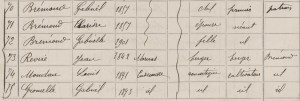 L’Etat-Civil numérisé de Caderousse aux Archives du Vaucluse va bien nous aider pour découvrir l’origine de cette famille. On doit remonter au début du XIXème siècle pour trouver un ancêtre commun aux 3 Poilus: le couple Simon Bruguier- Marie-Colombe Roussel vivant du côté de Bagnols-sur-Cèze dans le Gard. Ce sont les arrières-grands-parents de Léon, Marius et Martial. Simon est tourneur sur bois puis marchand, Marie, ménagère bien entendue.