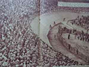 Une vue de cette rencontre entre Marseille et Antibes avec un bel envol de Mario Zatelli, l’avant-centre emblématique du club pour l’histoire. Le Vélodrome était loin ‘être bien garni dans le virage sud.