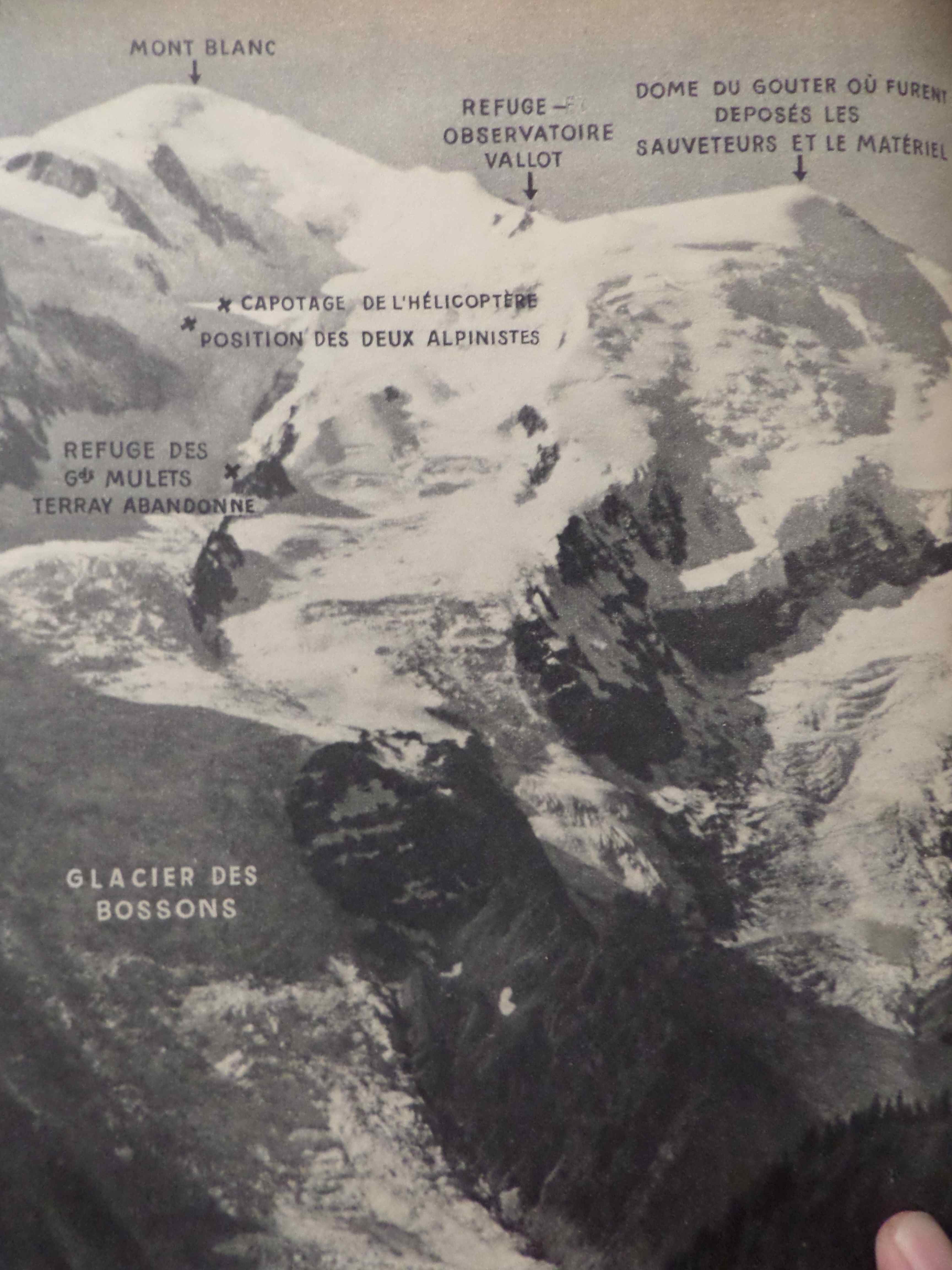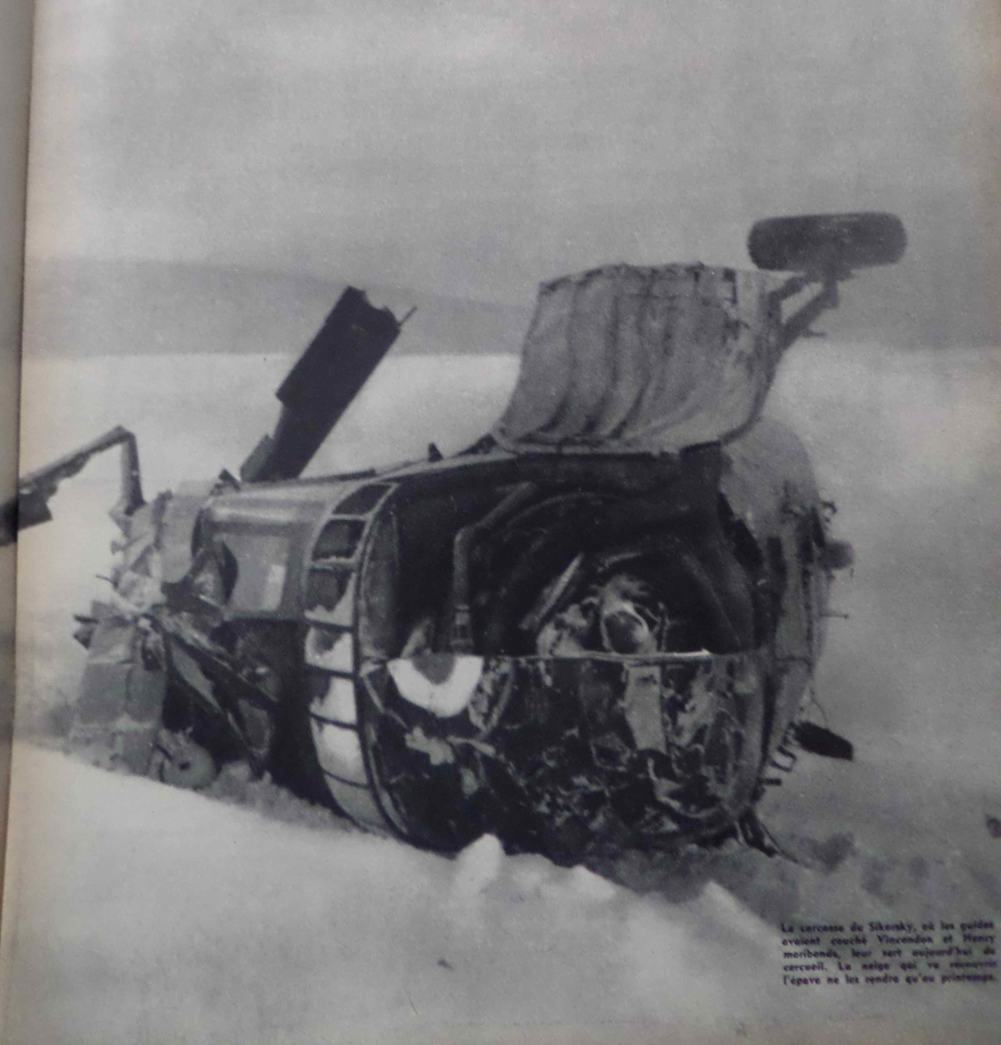Malheureusement, le gros engin peu maniable capota dans le secteur des naufragés avec quelques blessures pour le pilote et sans gravité pour les autres membres de l’expédition. L’équipe put rejoindre les jeunes alpinistes (d’où ces photos) mais ne put les transporter au refuge Vallot.