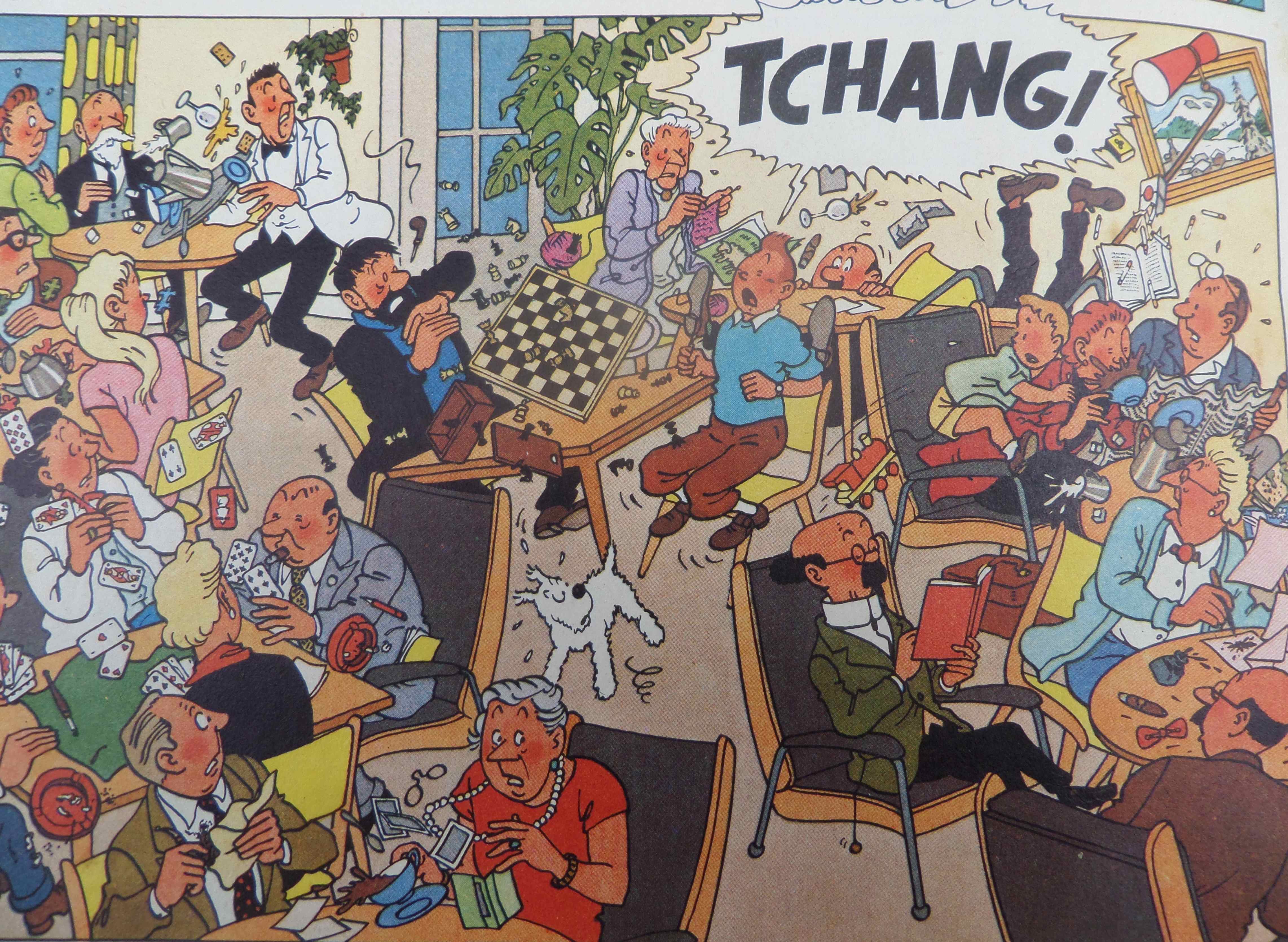 dans un de ces cadres remplis d’une foule de personnages et de détails dont raffolait Hergé.