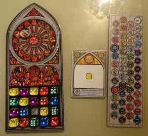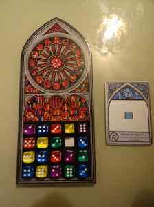 Ce jeu ressemble à bien des égards à AZUL mais là il s’agit de vitraux. Les dés remplacent les petits morceaux de verre, dès que l’on choisit à chaque tour à la manière de la pose des premières colonies des COLONS DE CATANE.