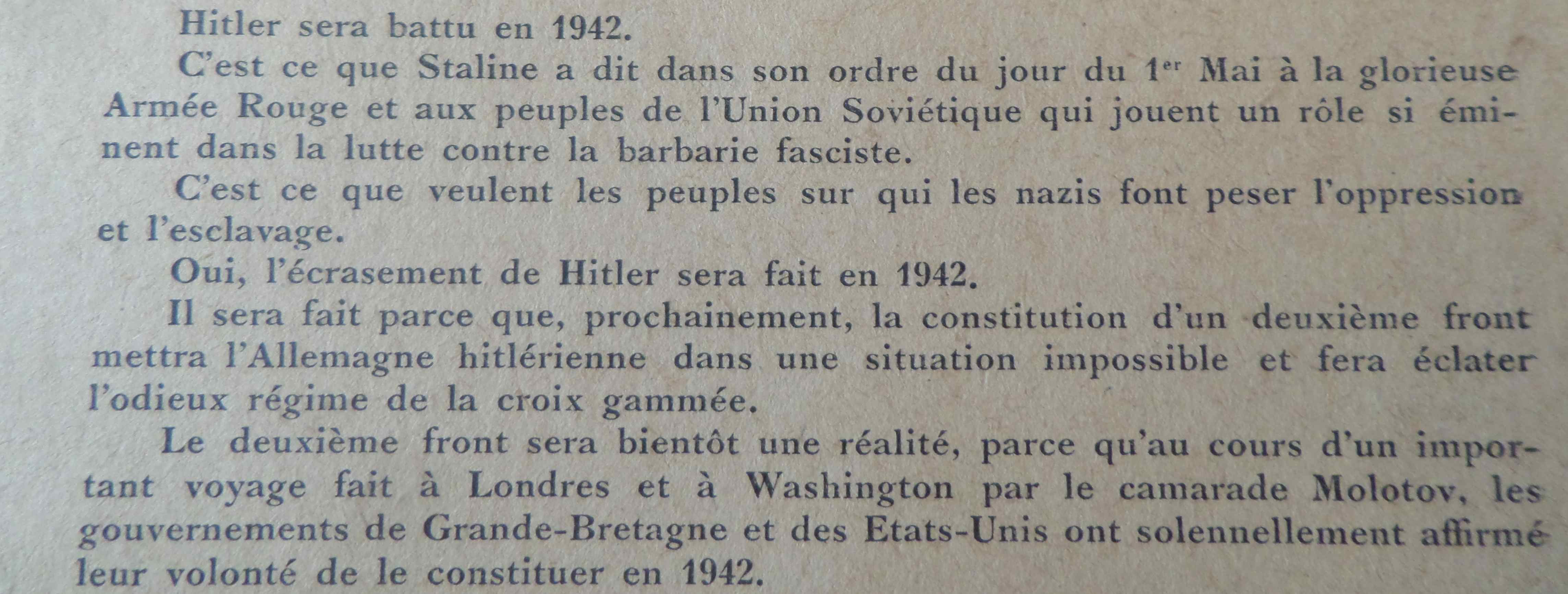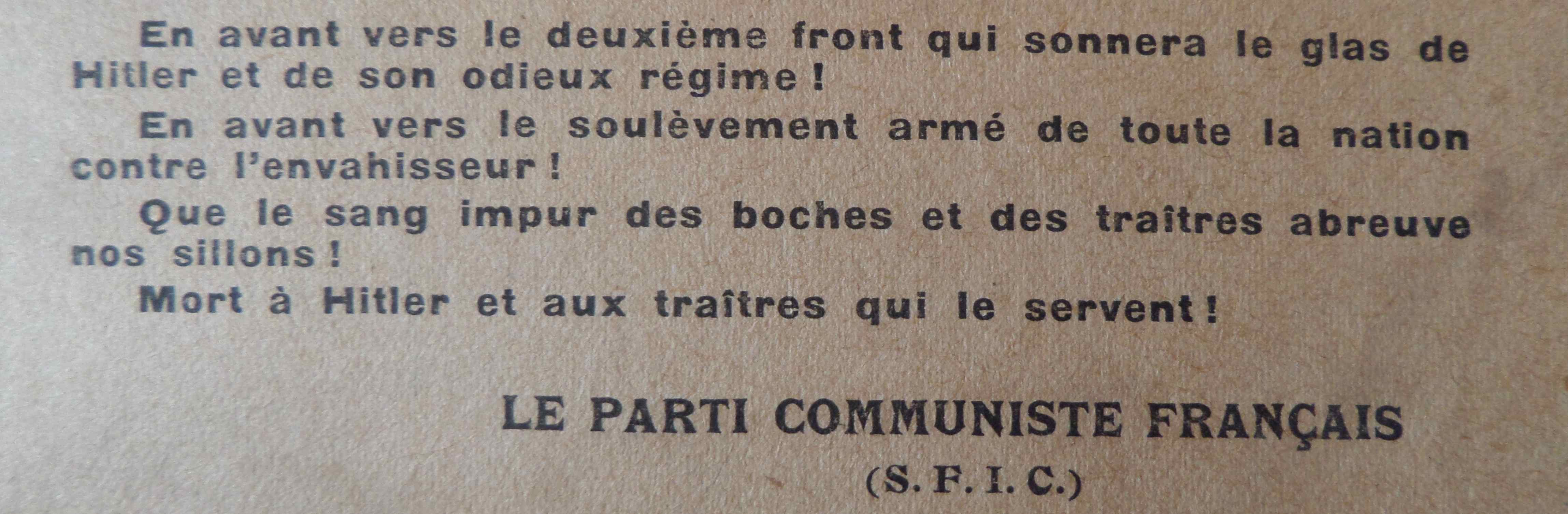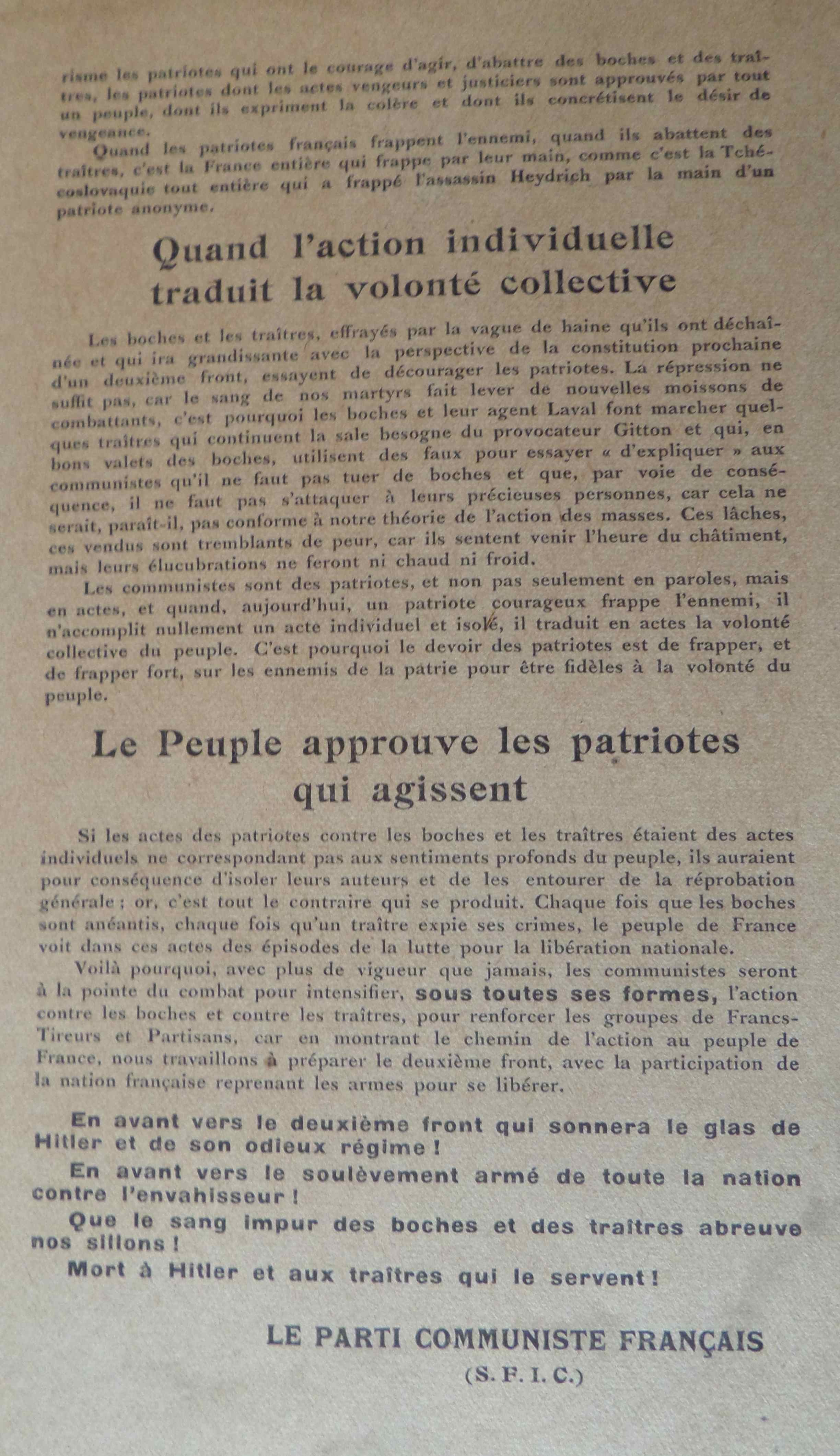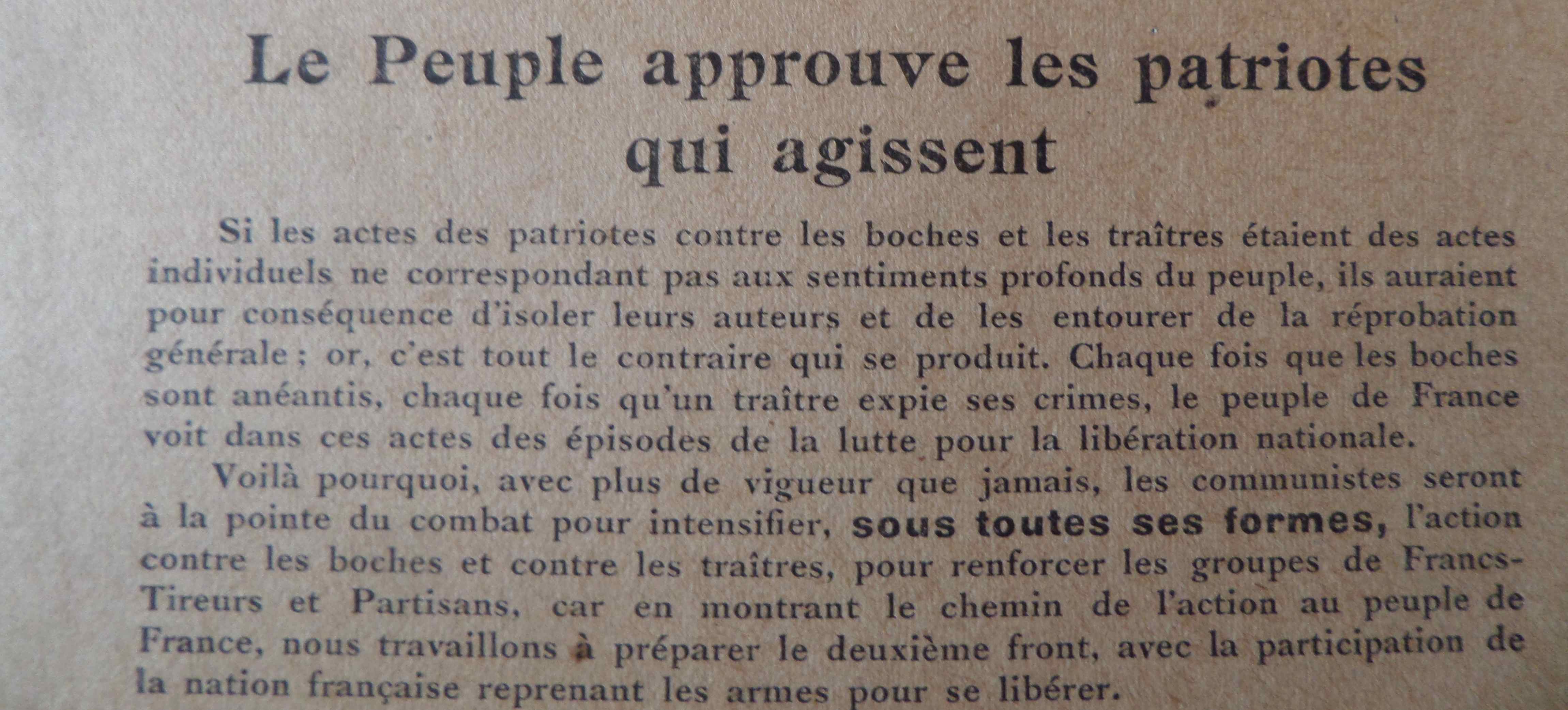 La vengeance a commencé. Des centaines de Boches pont payés de leur sang le sang de nos martyrs, des traîtres ont reçu le châtiment mérité et qui attend tous leurs congénères, des cheminots ont saboté les transports, envoyé des trains de munitions et de soldats boches dans les remblais, pour venger Sémard et Catelas, les métallos ont saboté, brisé des machines en souvenir de Timbaud, des détachements de francs-tireurs qui portent des dons glorieux : « Timbaud », « Simard », « Péri », « Catalas », « Cadras » etc.… ont exterminé des ennemis. Le souvenir de nos martyres et la haine sacrée de leurs assassins guident leur bras.