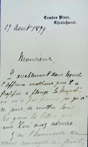 Alexandre Dumon continue de communiquer avec la famille impériale et à l’été 1879, il a adressé un certain nombre de documents à l’Impératrice Eugènie de Montijo. Avec cette lettre écrite par le Grand Chambellan du Palais, le duc de Bassano a l’honneur de renvoyer… les cinq pièces qui accompagnaient cette lettre et que vous pouvez avoir intérêt de conserver.