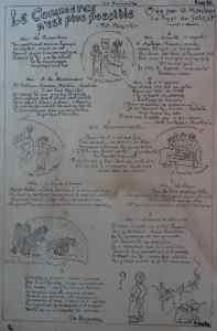 Une chanson en page 30, la quatrième de couverture: « le commerce n’est plus possible »: une chanson en plusieurs couplets pour dénoncer la fermeture d’un commerce de tranchée, d’un Foyer de Soldat par l’autorité militaire, commerce qui ne faisait aucun bénéfice mais procurait un peu de bonheur aux Poilus. On sent là qu’il s’agit d’une histoire vraie derrière les traits d’humour.