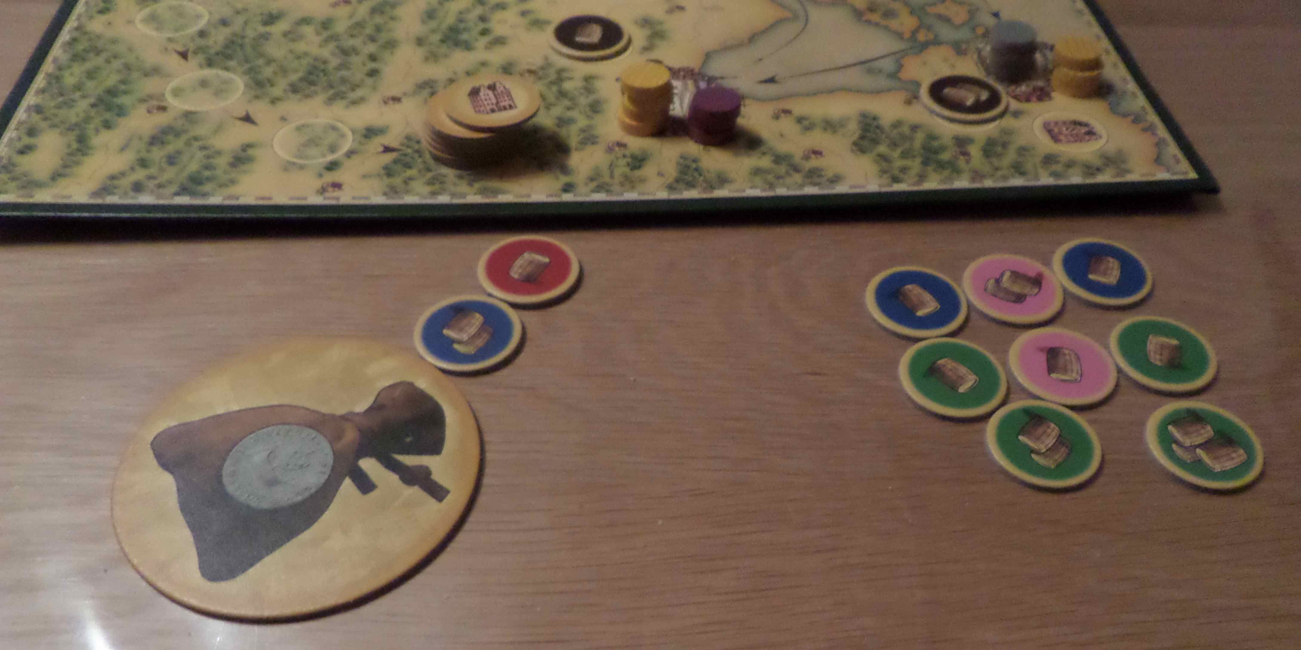 On essaie de rendre la partie plus rapide avec seulement 4 comptoirs et 5 marchandises à déposer dans les comptoirs adverses. Placement de début expert donc libre. La partie est équilibrée tout le long. Marie et moi faisons apparaître le voleur ce qui entraîne une perte de ressources assez importante en l’occasion (4 cartes). La chance et les tirages logiques (6 et 8) revenant sur la fin, je gagne de justesse, Daniel ayant certainement pu terminer juste après, dans le tour suivant.
