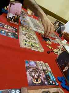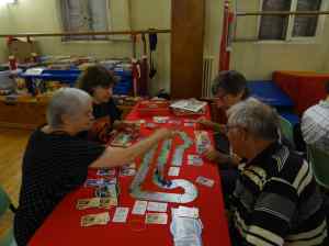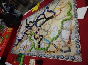 …gros wagons mais petites cartes (cartes normales du jeu tout public). Partie un peu longue pour Paul mais intéressante même si ne jouer qu’à 3 alors qu’on pourrait être 5 à se disputer les chemins a pour conséquence le fait qu’on ne se gêne pas et nuit ainsi à l’interactivité du jeu.