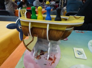 Dans les vaisseaux, les passagers et un capitaine changeant à chaque tour. Le problème: quitter le navire avant qu’il ne se scratche ! Car de tels navires sont fragiles et ne vont jamais très loin tant ils sont sujets aux fluctuations du climat. Si l’on descend au bon moment, on peut récupérer une carte avec des points, sinon, si l’on subit le scratch, on ne pend rien ce tour-là. Oui mais, il faut tout de même aller le plus loin possible car plus on va loin, plus on gagne une carte de forte valeur. Entre bluff et pari !