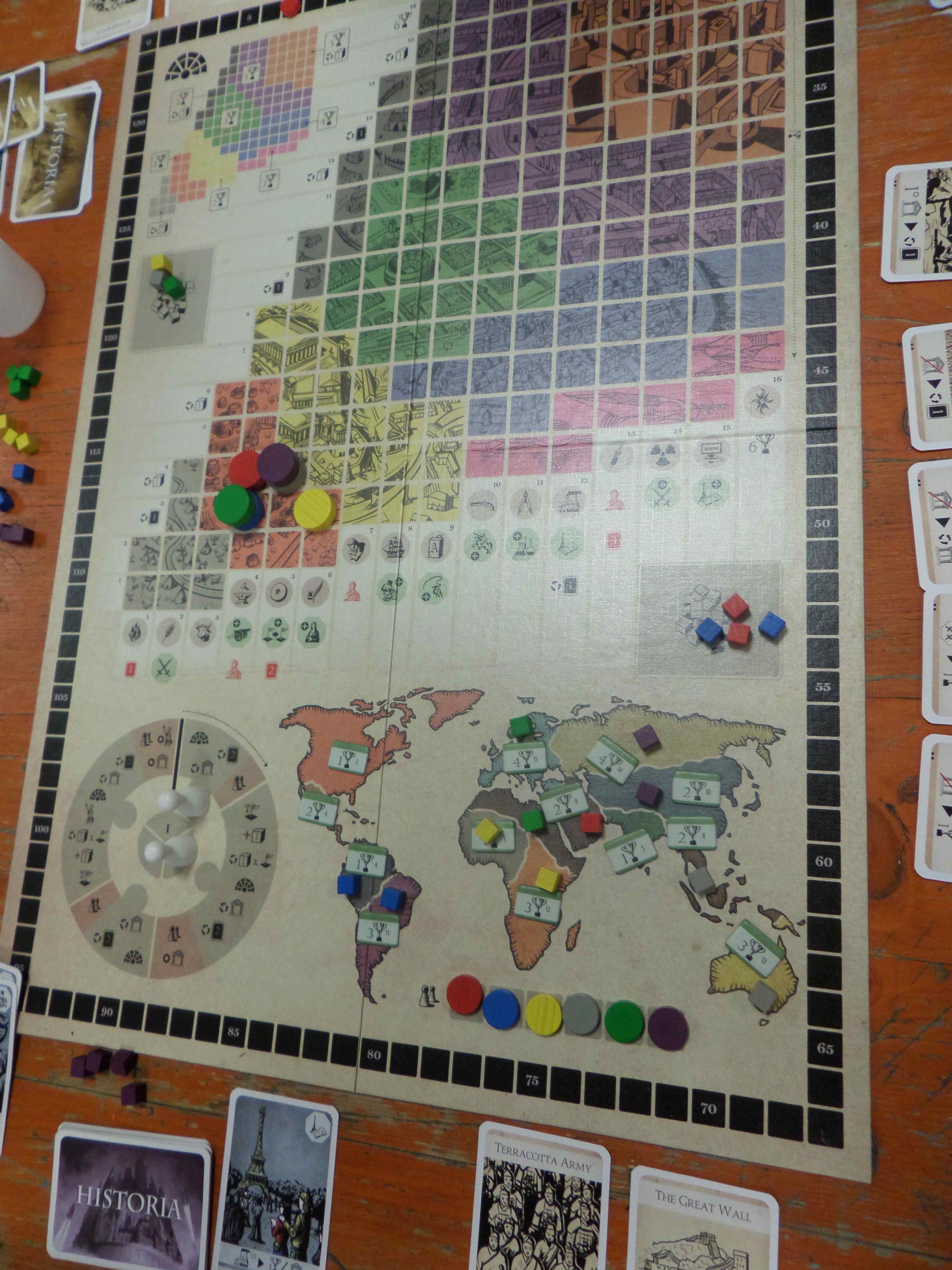 A ce petit jeu-là, le temps n’a pas paru long et je ne suis pas mal débrouillé en arrivant en tête au décompte final, misant pour la première partie du jeu sur la stabilité et le livre pour construire des merveilles puis en progressant sur le militaire par la suite en accumulant des points de victoire sur le plateau.