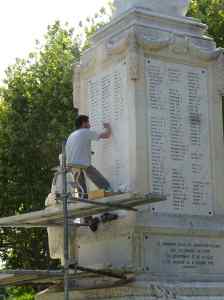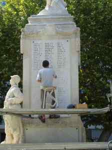 On lit RHÔNE et on devine 31 MAI 1856. Il s’agit là du repère posé sur la culée du pont de Rochemaure, rive gauche. Il en existe quatre autres plaques datées du même jour, seulement sur Ancône; plus de 200 sur tout le sillon rhodanien.