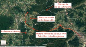 La troupe débarque à 5 heures du matin et va devoir, en marche forcée, avec un barda de 25 kilogrammes sur le dos, se porter au devant des Allemands dans la vallée voisine d’Autrey- Saint-Benoît-Bru. Le rédacteur du Journal de Marche du 163ème de Ligne emploie l’expression « étape longue et pénible ». Sur Google Maps, on peut évaluer cela à 28 kilomètres le chemin pour atteinte de Saint-Dié, le bois d’ Anglemont sous un soleil de plomb et sans savoir quel accueil sera fait à ce petit monde à l’arrivée.