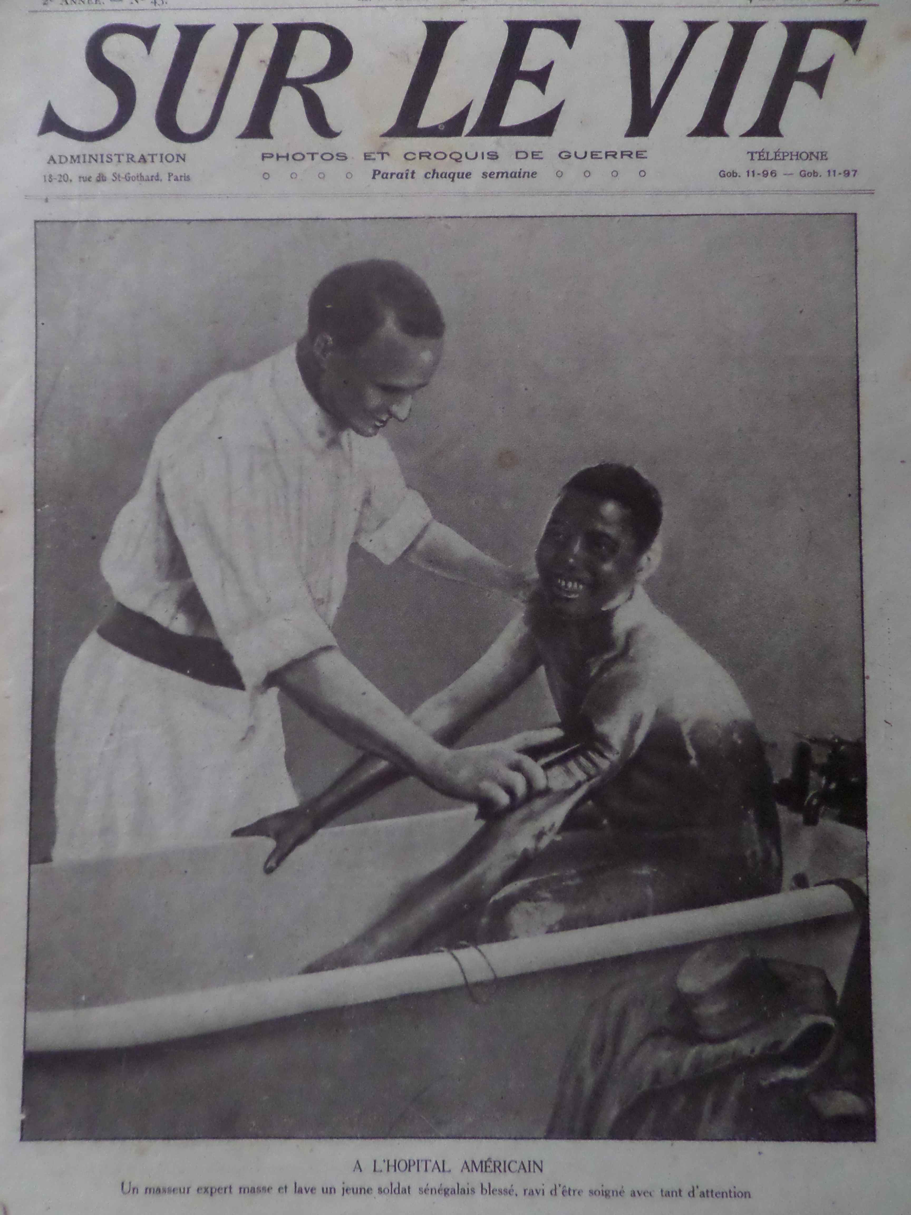 Une couverture déjà vue quelque part, certainement dans le Miroir il y a quelques semaines. Un tirailleur sénégalais blessé et (bien) soigné à l’hôpital américain. Cela semble normal mais les journaux insistent sur ce fait.
