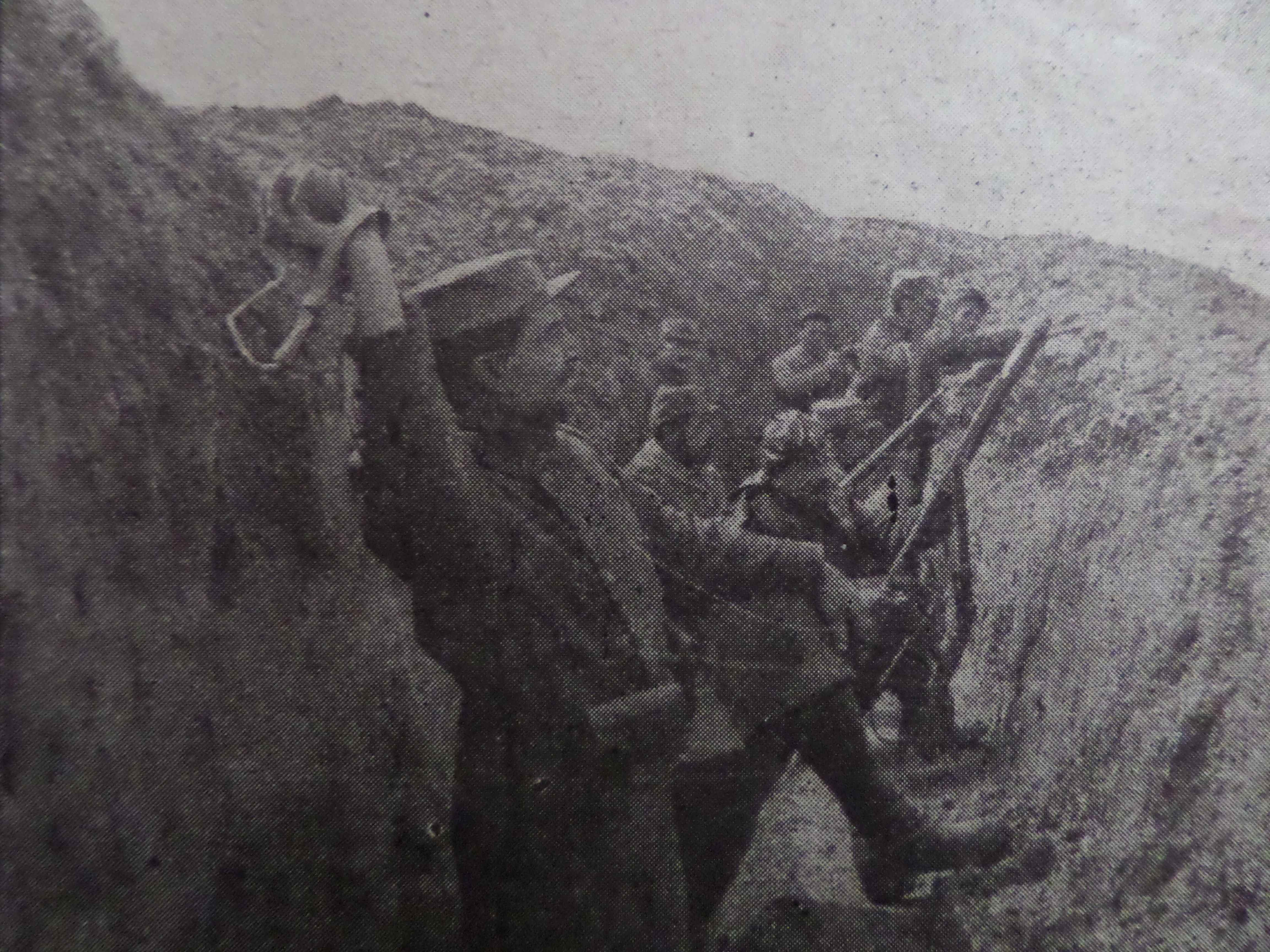 Commençons par le comique avec ces nouvelles recrues s’entraînant à creuser des tranchées dans le sable de la plage.