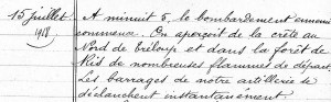 Le voici dans le bois de la Grurie. A peine s’installe-t-il qu’il est jeté en pleine bataille, raconte l’Historique du 255ème Régiment d’Infanterie. Le 20 juin, en effet, il est attaqué après avoir subi un bombardement d’une intensité inouïe par torpilles et obus de gros calibres… Un instant décimé par le bombardement, le 255ème cède sous la poussée ennemie mais l’ardeur des chefs et l’élan des troupes ont rapidement reconquis le terrain perdu.
