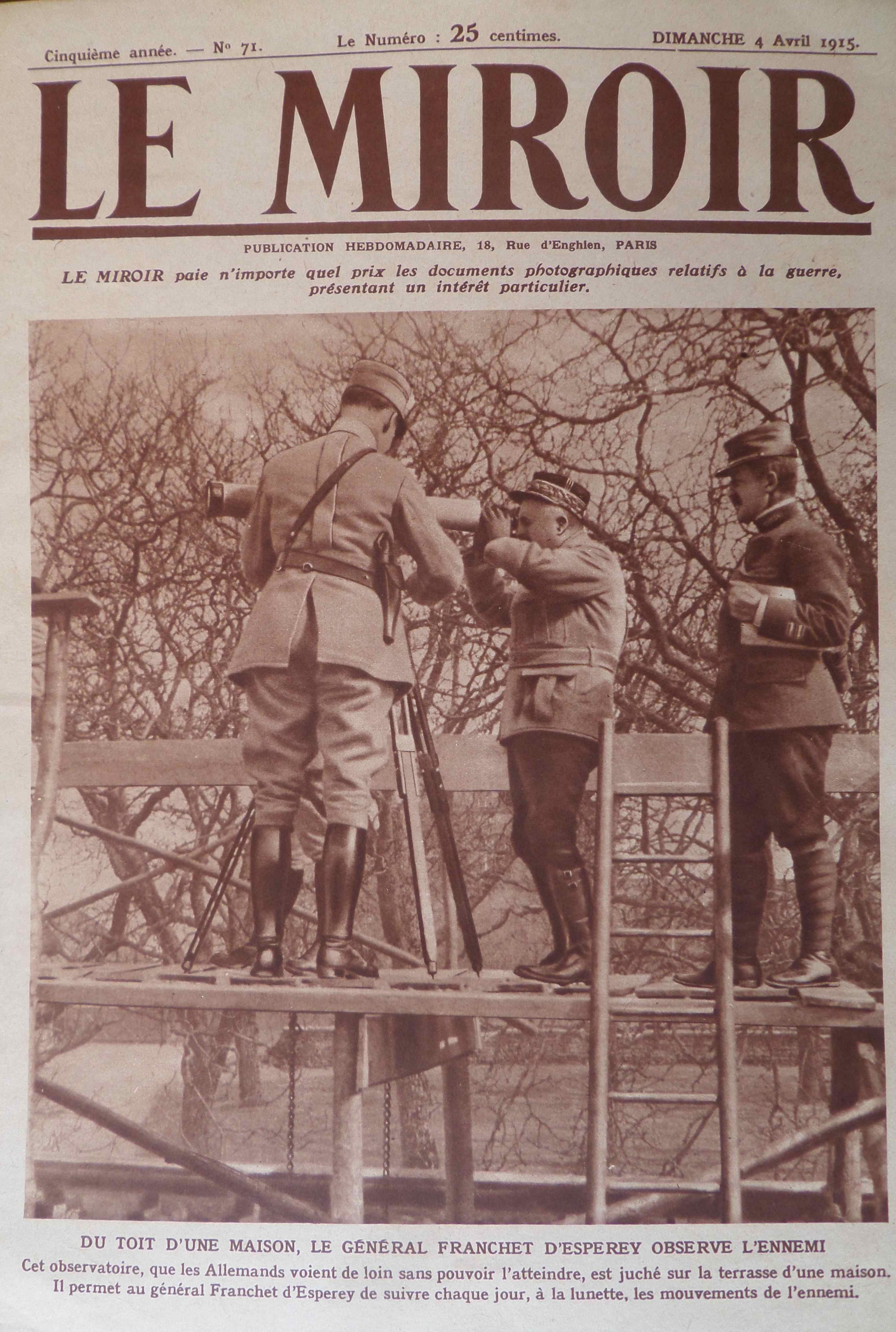 Pendant que Sur le Vif présente les avantages de l’observation aérienne par les avions, Le Miroir fait sa une d’un général perché sur un échafaudage pour voir ce qui se passe dans les lignes ennemies… Pas vraiment moderne, mais le but du Miroir n’est-il pas de faire la part belle aux hauts gradés ?
