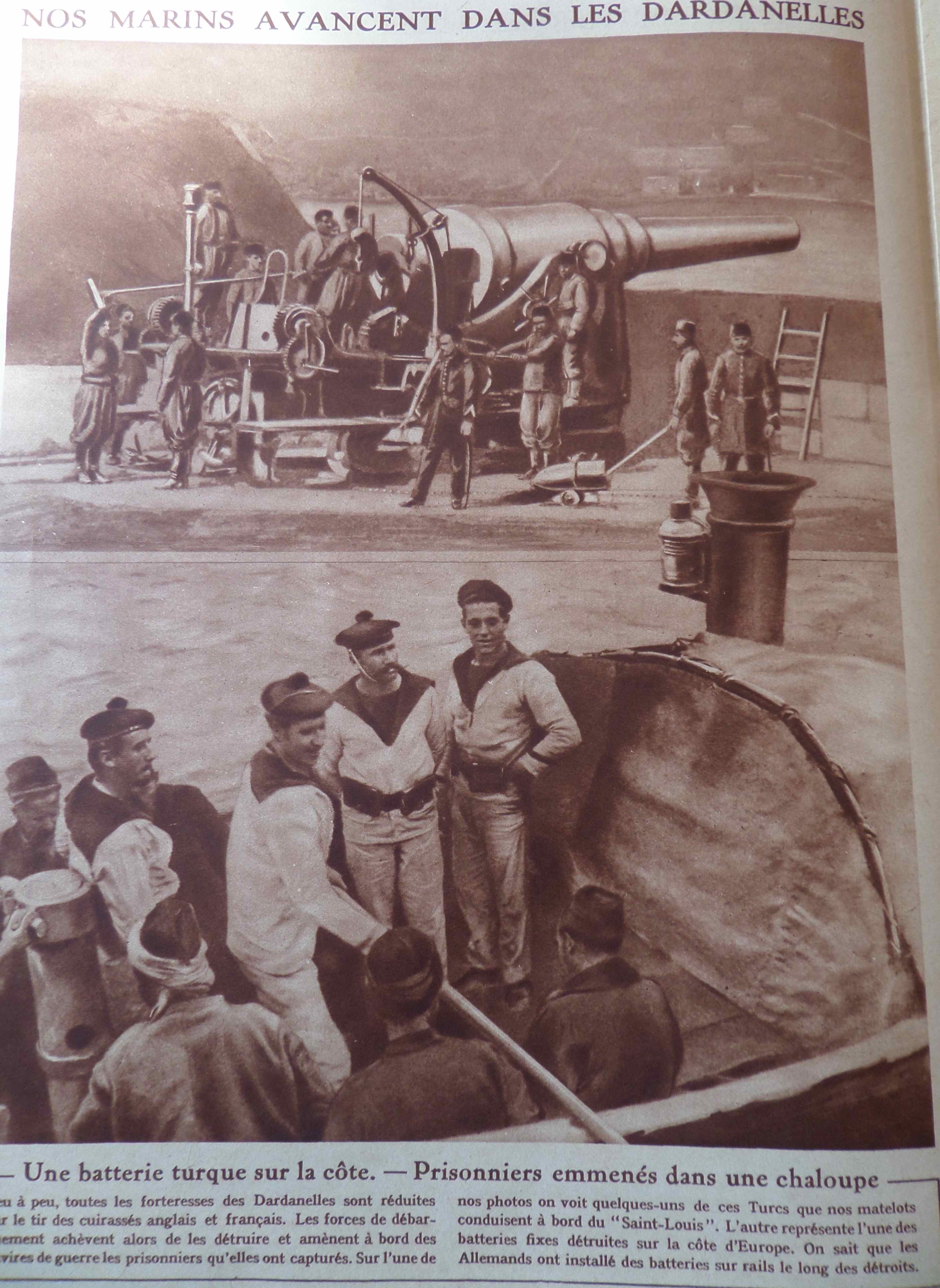 en haut les batteries turques qui protègent le détroit en tirant sur les navires alliés et en bas, les premiers prisonniers de cette opération.