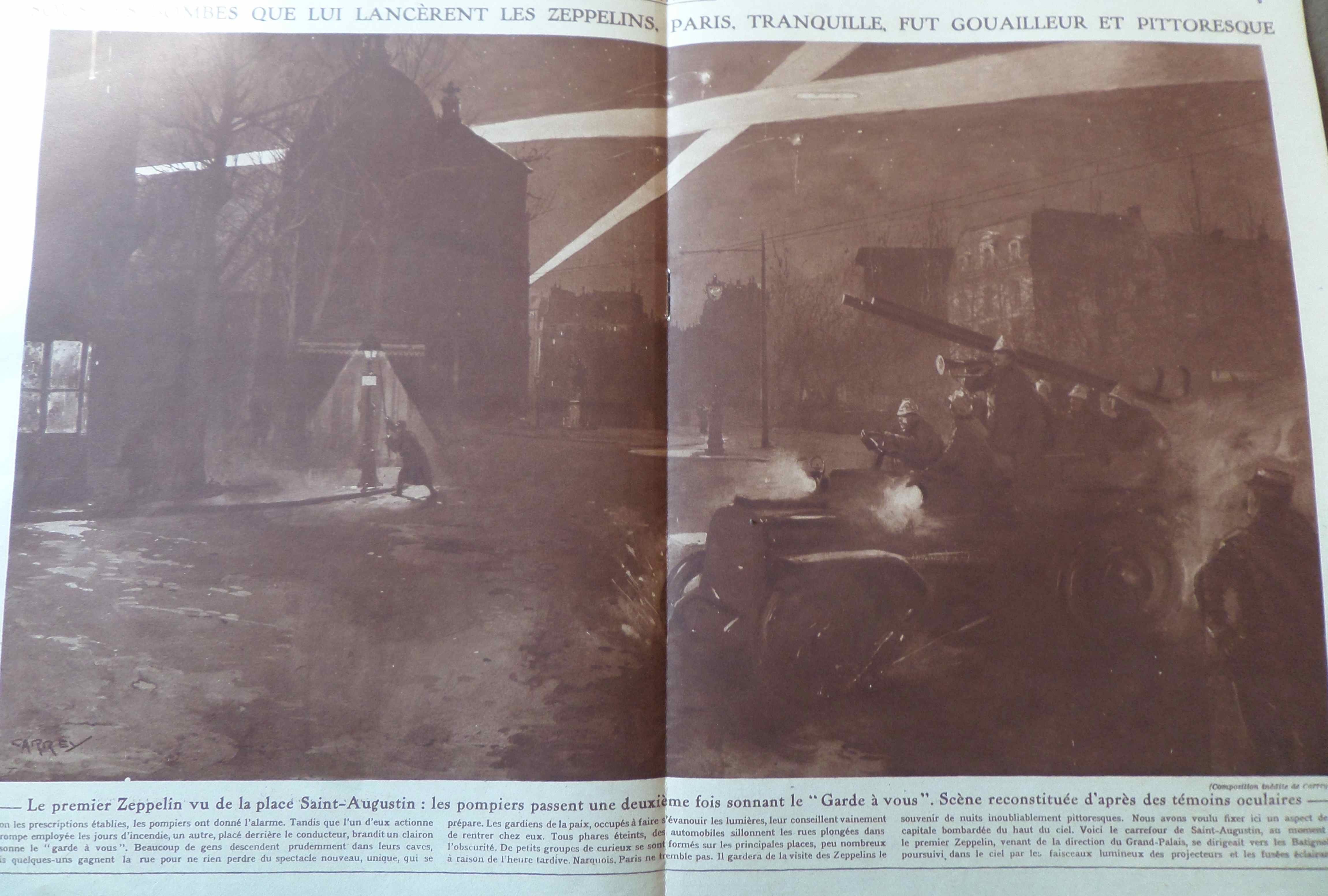 Le raid des Zeppelins sur la France est évoqué différemment dans Le Miroir que dans Sur le Vif. C‘est le dessinateur Carrey qui a essayé de faire vivre la scène de ce bombardement nocturne sur Paris en montrant l’intervention des pompiers dans un grand dessin en double page centrale.