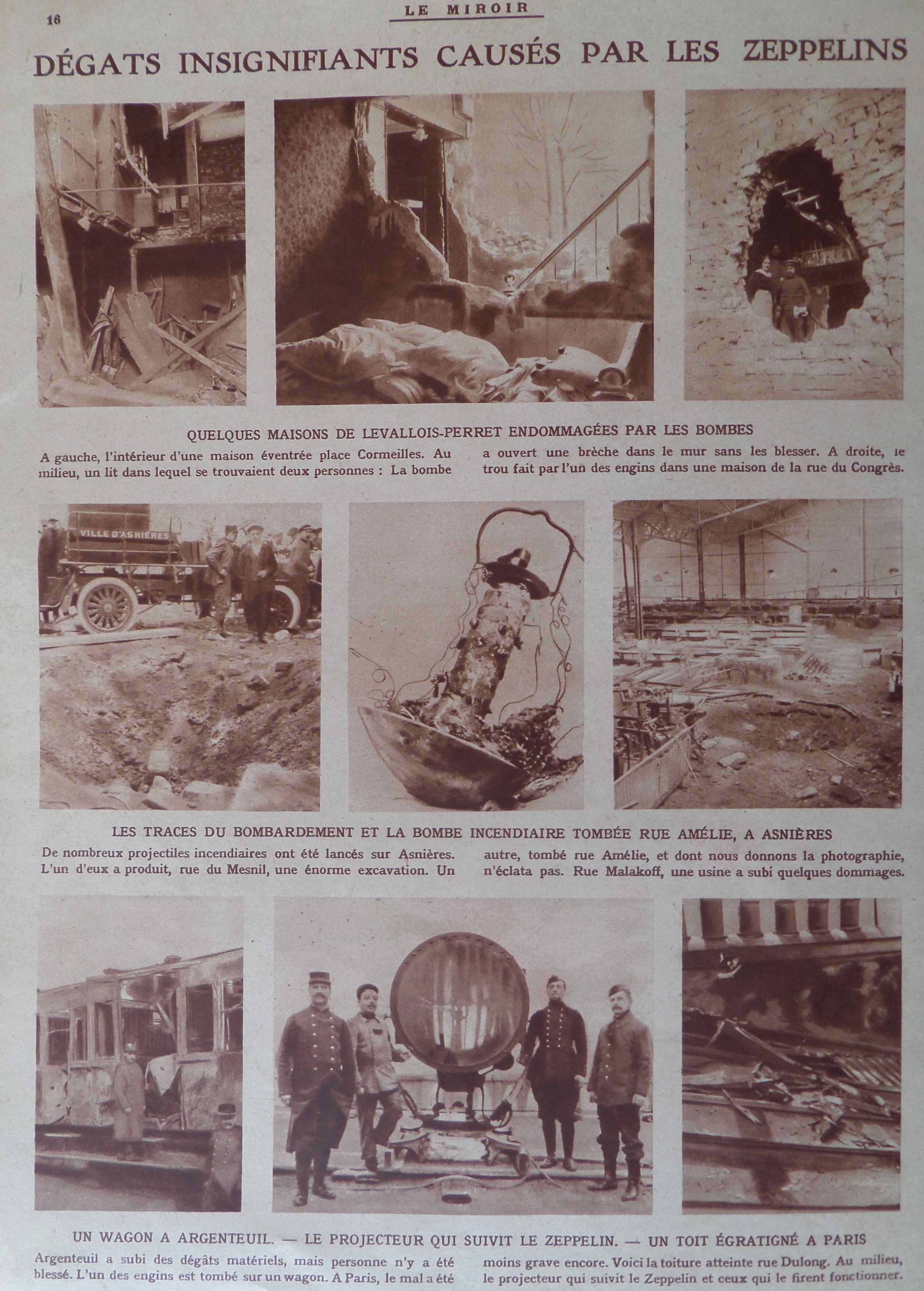 Les destructions à Levallois et Asnières semblent plus importantes que sur Paris. On nous présente à ce que ressemble une bombe incendiaire et les projecteurs servant à repérer les dirigeables.