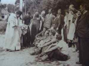 Le personnel assurant la sécurité sur l’hippodrome en écartant la foule des concurrents (la discipline allemande ! on est loin de l’anarchie qui régnait et qu’on a vu au départ en France !) et en bas, les officiels dont le baron de Zuylen président de l’Automobile-Club de France et le comte de Ratibor, son alter ego pour le Deutsch Automobil-Club.