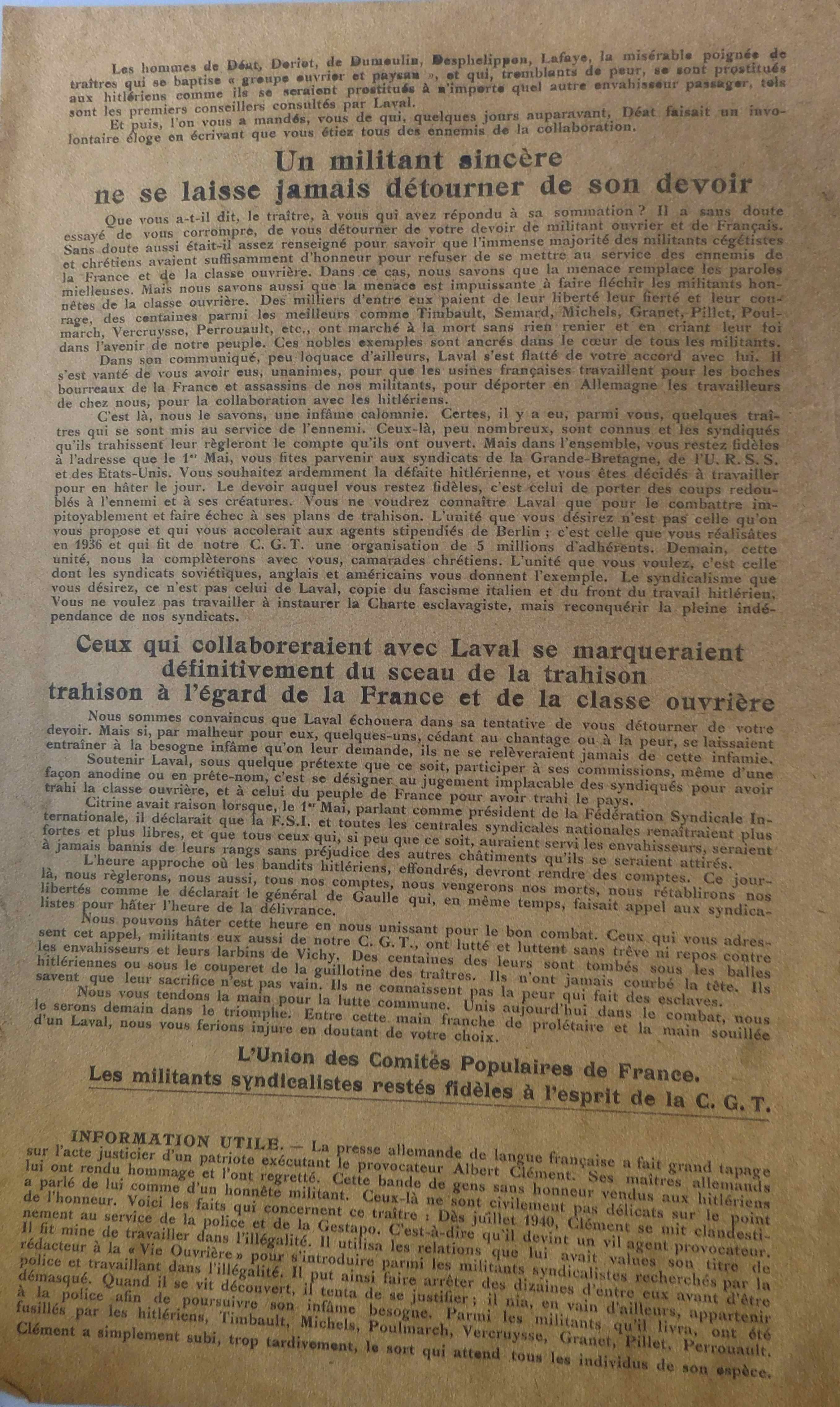 Un tract de 2 pages (1 feuille recto-verso) ronéotypées, un journal: La Vie Ouvrière, organe de la CGT qui perdure de nos jours, feuille clandestine en 1942. Une date: celle du 17 octobre 1942, une consigne: NE JETEZ PAS CE JOURNAL. FAITES LE CIRCULER.