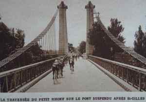 …souvent photographié sur les cartes postales anciennes qui remplaça le pont de barques mais qui ne fut jamais trop solide. D’ailleurs, quand le Tour de France 1938 l’emprunte lors de l’étape Montpellier-Marseille du lundi 11 juillet…